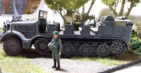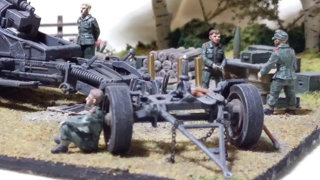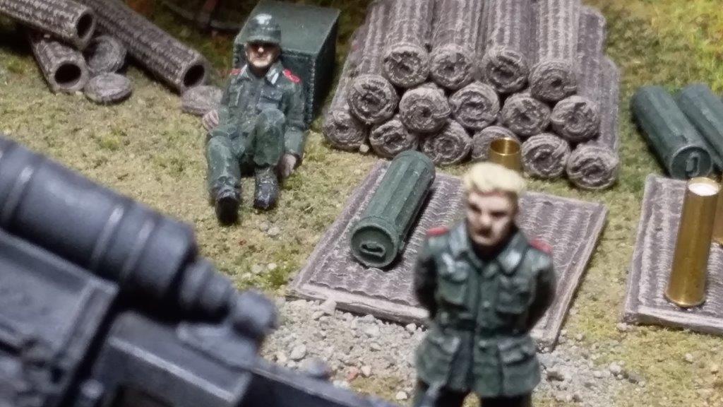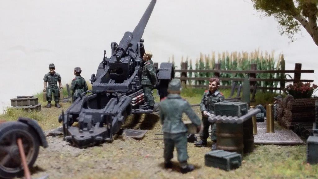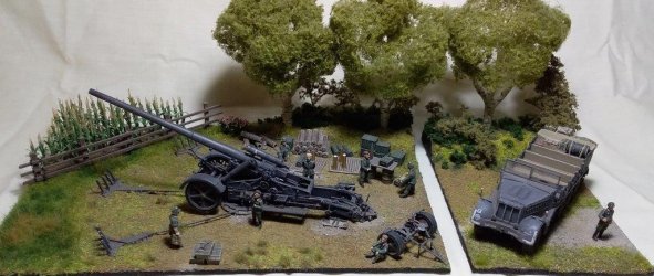 | Here's a diorama I call "The Scarecrow". I used the Revell Kanone 18 170mm Gun and sdkfz 9 Famo kit. The famo with the CMK artillery prime mover conversion kit is the same one already in the gallery. It was supposed to go on the base with the gun but there wasn't enough room. All the figures are by AB Miniatures, most of them are from a POW set. I ordered the MR Modellbau upgrade and accessory set as an afterthought to get some ammo for the gun, therefore it was too late to use the resin wheels and turned aluminium gun barrel. Most of the scenic material is by Woodland Scenics, but not sure of the maker of the corn plants. Monty's caravan (Matchbox) kindly donated the little table made of oil drums and corrugated iron, and the fence is balsawood. Other bits and pieces came from the good ol' spares box. |