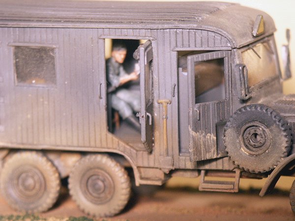 | Assembly went pretty well and it looks fairly accurate. No interior detail on walls but does include desk and cabinets. No radio, antenna or other assesories. Clean-up was easy. The rear door was too short and had to be lengthened. The model is noticeably longer and wider than the MAC Distribution/ZV Models kit of the uniform diesel. At 88-mm long the model scales out at 1/66 scale (based on a vehicle length of 5850-mm) which seems odd. |