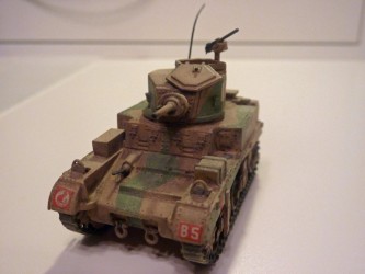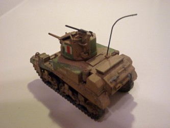 | This is a British M3 Stuart Honey. I made a number of modifications to this Hasegawa kit to get it to a better standard, including: scratchbuilt headlamp guards and kitbashed headlamp, removal of molded on pioneer tools, addition of ammo box to machine gun, covers for old gun ports, and much more. |