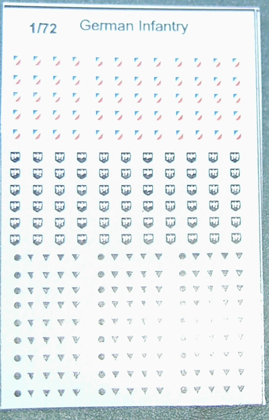 | German Infantry uniform insignia | - The only available decals of this type as far as I know. You get 60 eagle helmet decals; 60 tricolor helmet shields but with blue instead of black and 27x5 sleeve insignia for the ranks of Obersoldat to Stabsgefreiter. On the black triangles the white stripes suffer from irregular printing to the extent that some are plain black. Adhesion is not very good, but decals are thin. They are printed on continuous film. - R Haelterman | Picture | ||