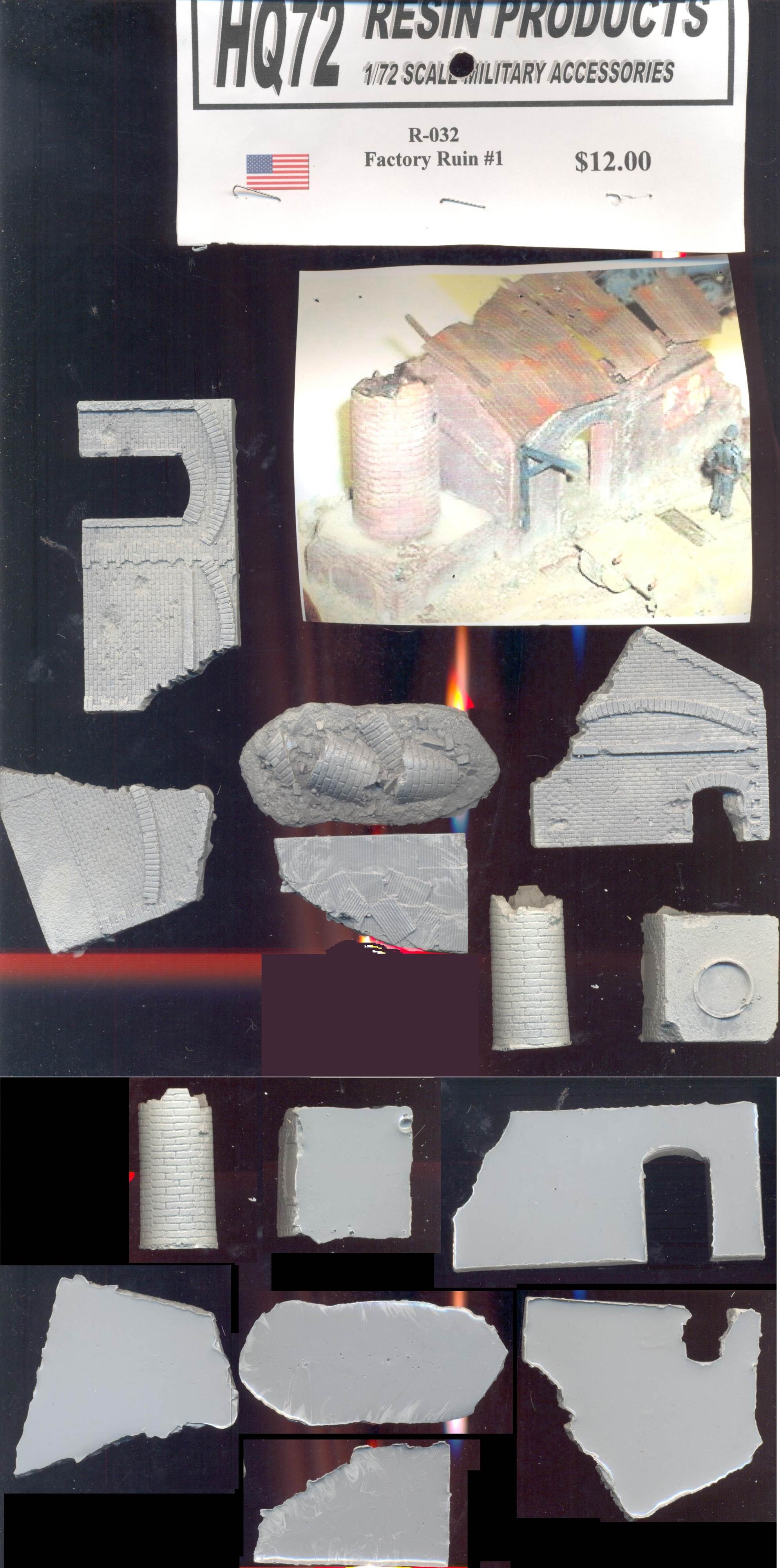 under the Tiger Productions - Escala 72 range as Ref 72007.) For a structure of this size, the casting is quite nice. There is no warping, nice detail on the outside, but quite a number of pinholes (air bubbles), part of which might pass as bullet holes, as this is a ruin after all. Clean-up will be minimal as there is no excess resin. Most of the work will go into the creation of some detail on the inside. - R. Haelterman |