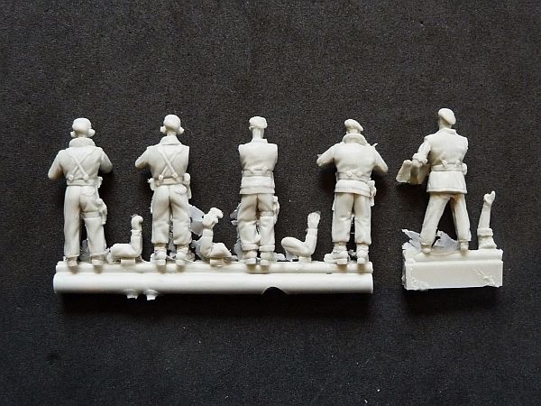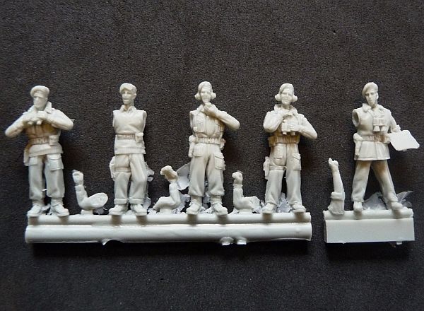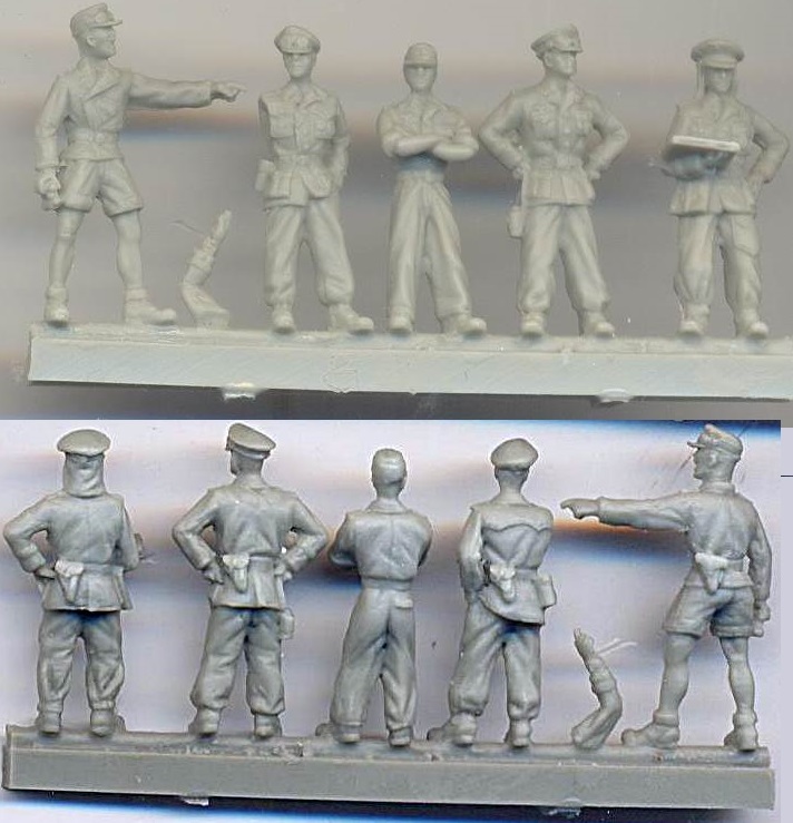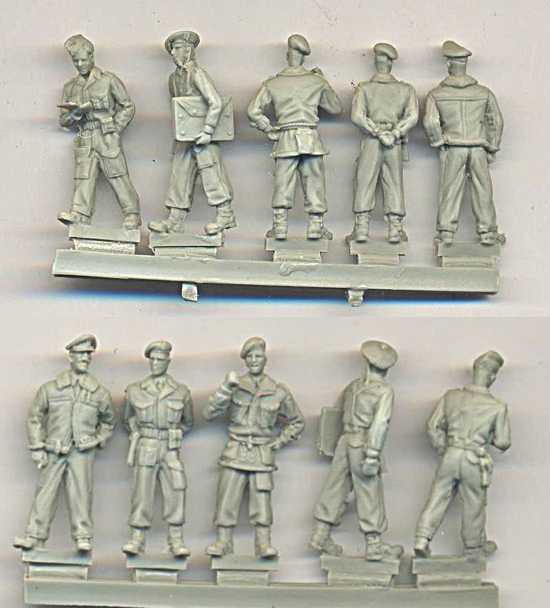 FIG058 British Officers (circa 1944) Nicely sculpted set of 5 figures wearing different types of uniforms. Marketed as 1/76, they are, at 23mm height, perhaps on the small side for 1/72. Nevertheless, given the poses and quality of casting and detail, useful for 1/72 in my opinion. - R. Haelterman  Picture