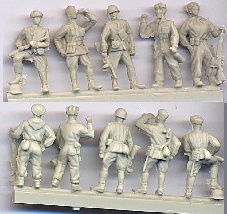 FIG082 Soviet Soldiers in various poses Nicely sculpted set, although on my example the influence of worn molds was felt. The figures are in relaxed poses; one is a tanker, one a female sniper. At 23mm height perhaps on the small side for 1/72. (They are marketed as 1/76, for which they scale out correctly.) - R. Haelterman Picture
