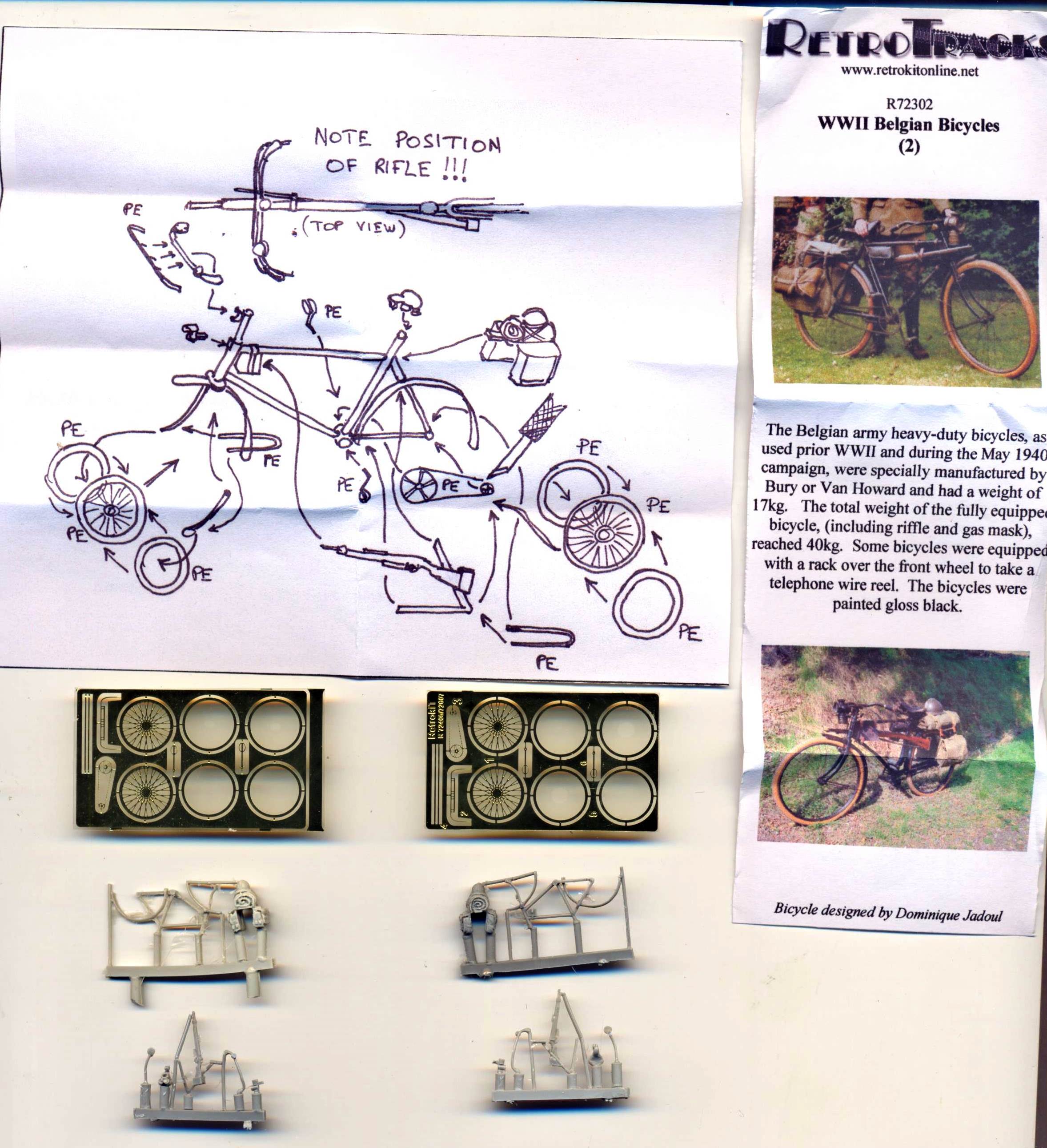 R72302 2 Belgian Bicycles (for figures R72606/07) 2 identical, finely cast and well detailed resin bikes with PE parts. Resin parts are protected by a film to keep them from bending inadvertently. - R. Haelterman