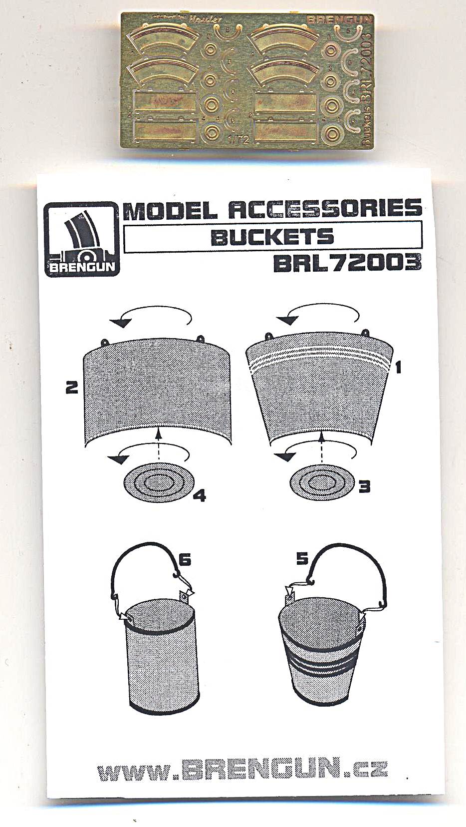 BRL72003 Buckets Set of 8 photo-etch buckets in two type (conical and cylindrical). PE is etched on both sides. Diameters are 2.7 and 3.3mm respectively (measured at the bottom) and heights are 3.7mm for both. - R. Haelterman Picture