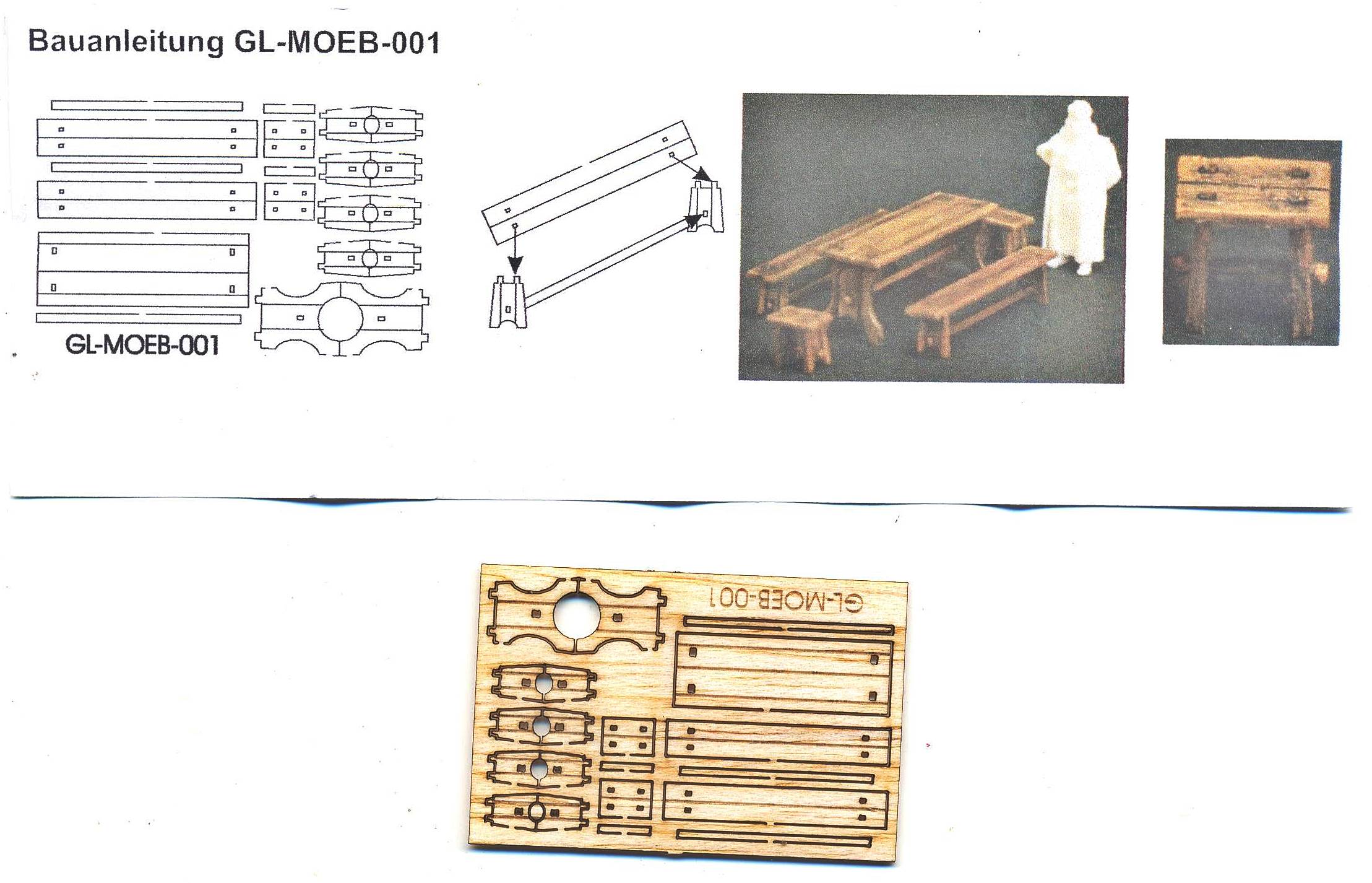 | GL-MOEB-001 | Table, benches and stools. | Laser cut wood. Medieval style, but probably ok for a provincial pub. | Picture | ||