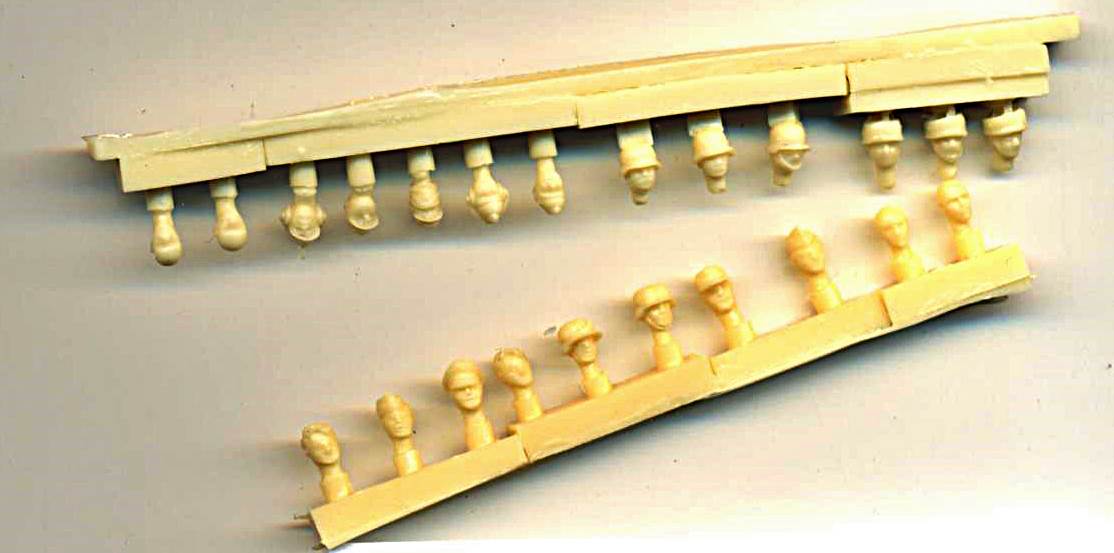 MP.72-077 WWII German head set 23 heads. 6 bare headed, of which 4 are bald; 3 wearing the paratrooper helmet (which needs to be reshaped after removing from the sprue); 5 with regular helmet (one of which is wearing a balaclava and two of which that have goggles on the helmet); 4 wearing the early field cap (one of which is wearing headphones); 4 with the Einheidsfeldmutze/tropical cap (if you are not too picky about the size of the visor), one of which is wearing a scarf in front of his mouth and one of which is wearing headphones; one which is wearing the "officer's cap". Picture