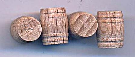 | RB3810 | Wooden barrels (4pc) | Made of wood 10.3mm high, 7.6mm wide. Nicely detailed on the side with a fine wooden grain texture that will probably stand out convincingly after a simple wash. No detail on top or bottom however. - R. Haelterman |