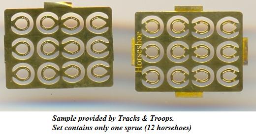 Each set contains 12 PE horseshoes (6 each of two slightly different types) which look like a "quarter clipped front shoe, three quarter fullered" type to me. They scale out at approx. 210mm, or just about the largest commonly used horseshoes. Detail is very nice, and will make for that 'little extra touch' on your AFV. - R. Haelterman