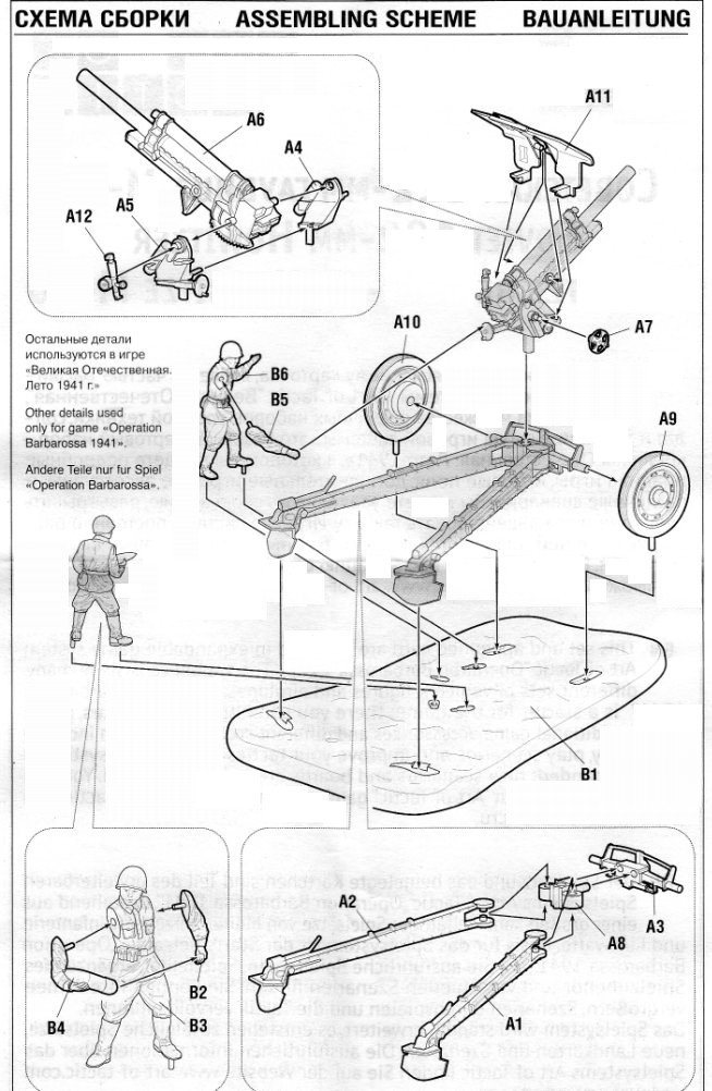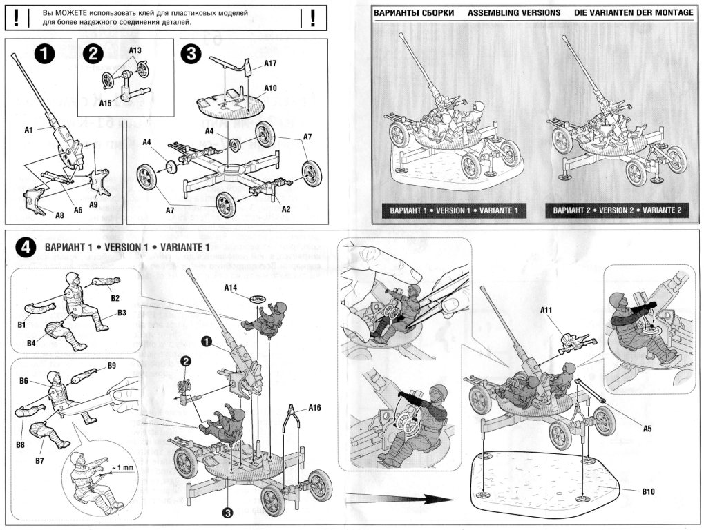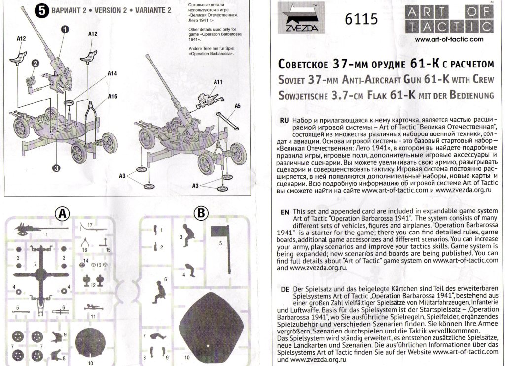 6115 Soviet 37mm AA Gun 61-K with Crew Molded in "semi-hard plastic", which isn't as hard as "normal" kits but harder than the Revell leFH 18 or Italeri's Zis-3 and PaK 40. The cannon is pretty well made, no sinkmarks whatsoever and it can be assembled with or without gun crew. - Victor Hugo Peña Instruction Sheet pg.1
