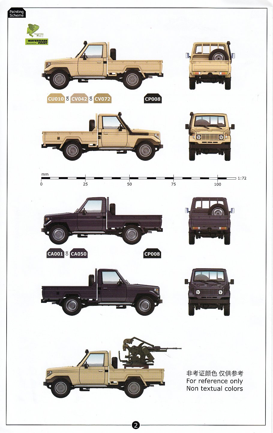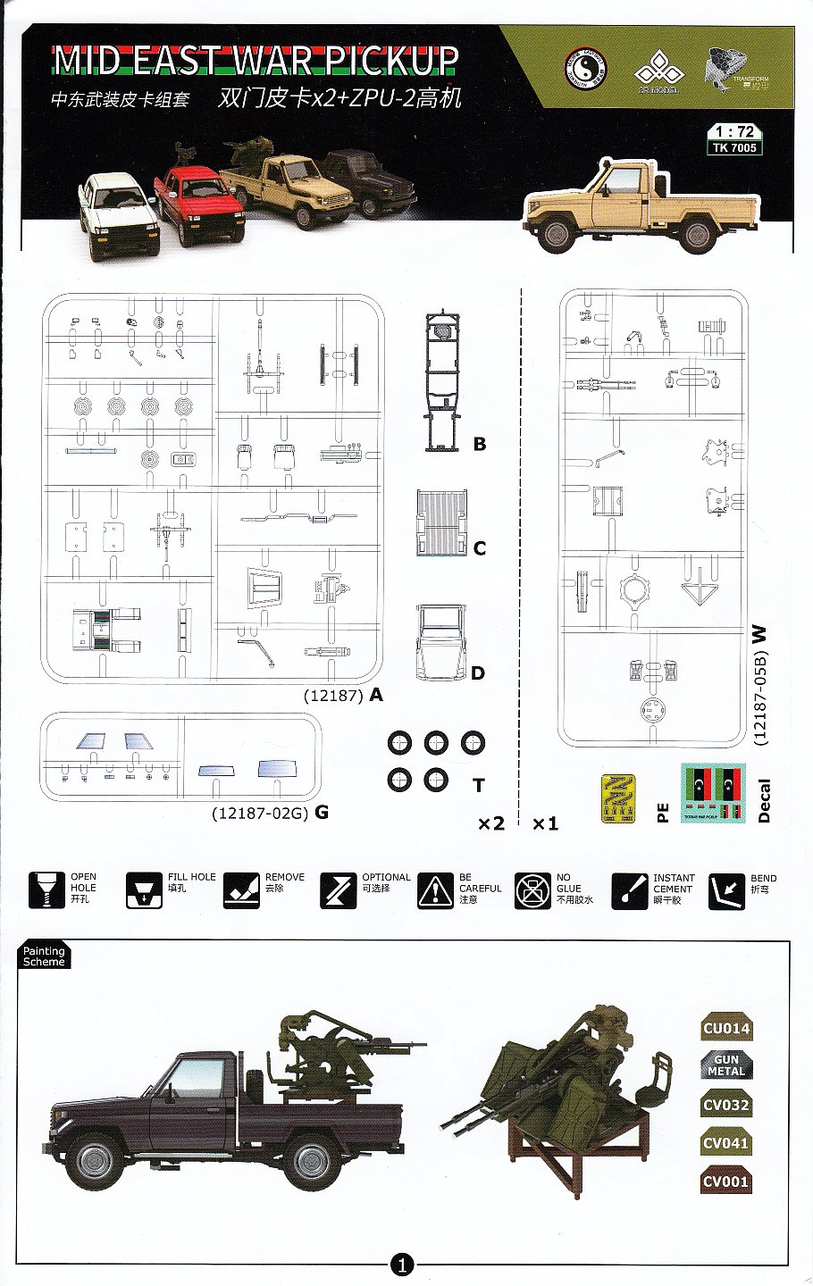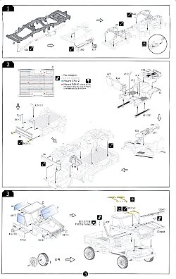 Included inside the top opening box are a pair of kits, with parts for one vehicle armed with a twin barrelled ZPU-2 cannon and another unarmed. Each truck is built from 33 parts of injected light grey polystyrene plastic on a single sprue plus another 10 exceptionally clear parts for all the windows, tail lights, marker lights and head lights. There is also a slide moulded cabin and pickup bed. Overall detail is quite nice.