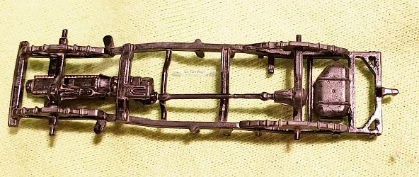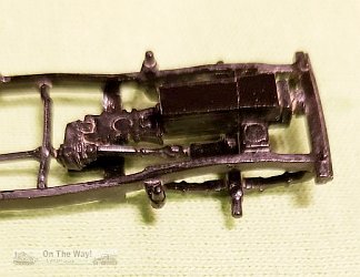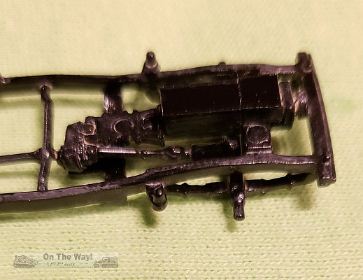 Constructions started at Step 1 with the chassis. This I found too be a bit rough, requiring sanding to smooth it out as much as possible. Instructions were a bit vague regarding the placement of the trans-axles to the transmission. I did not add the exhaust system as directed. A test fit showed that I could add this later (though this would require some tricky manoeuvring around the frame members). I also added a couple of pieces of plastic to represent an engine block.