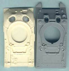 | This Sherman conversion set is designed to convert our regular 1/72-scale M4 or M4A1 kits into a Sherman 1c Firefly Hybrid kit, i.e. a 17 Pounder armed M4 Composite hull in US Army vernacular. The term “Hybrid” is a British term. This is one of my favorite Sherman variants! By looking at the hull we can see that it consists of the front 1/3 of the cast large-hatch M4A1 hull and the rear 2/3 of the welded M4 hull. This combination allowed less welding and faster assembly of the tank. The composite hull was first produced with the small hatch cast hull but the large majority were with the large driver’s hatches. Even though it is a large-hatch M4 it has the original dry ammunition storage in the hull sponsons, hence the three appliqué armor plates on the hull sides. This conversion kit is designed for the Dragon kits with VVSS bogies but I recommend we use the Trumpeter M4A3 kit with VVSS suspension as the Trumpeter model is a decent kit and the Dragon hulls are just too nice to not use. I have not seen this composite hull used with the wide HVSS bogies but there could have been post war upgrades. The upper left, smaller storage box mounts on the rear engine deck of the Firefly 1c so would be normal for this Firefly 1c Hybrid. Check you references as there could be field modifications and exceptions. In the center we have two small spare-track brackets that mount on the glacis plates below the driver’s hatches. Below center there are two long strips of spare track. These lengths of track could be mounted on the front, or after being bent in hot water attached around the Firefly turret. Again, check reference photos, as there could be great variation in applying spare track as supplemental armor. On the other pour plug are the two hatches and front fenders. The hull piece has the features of the Firefly: the long (gun cleaning?) rod on the left side of the engine deck and the 17 Pounder gun travel lock lying down on the engine deck. Particular to British Shermans and Fireflies are the two bottle-shaped fire extinguishers mounted on the rear corners of the engine deck. On the left of the rear plate is a small (first aid?) box. On the sides of the resin hull we see the three applique armor plates, characteristic of dry ammunition storage in the hull sponsons. The only problem, though not major, is that the weld seams between the cast and the welded hull sections appear too prominent for the scale. On most composite hull Shermans the hull weld seam should run through the right front appliqué armor plate indicating the appliqué armor was of two pieces; 72nd Brigade depicts this appliqué plate covering the hull weld. A third variation I’ve seen is the appliqué plate with a split with no weld connecting the two plate parts.