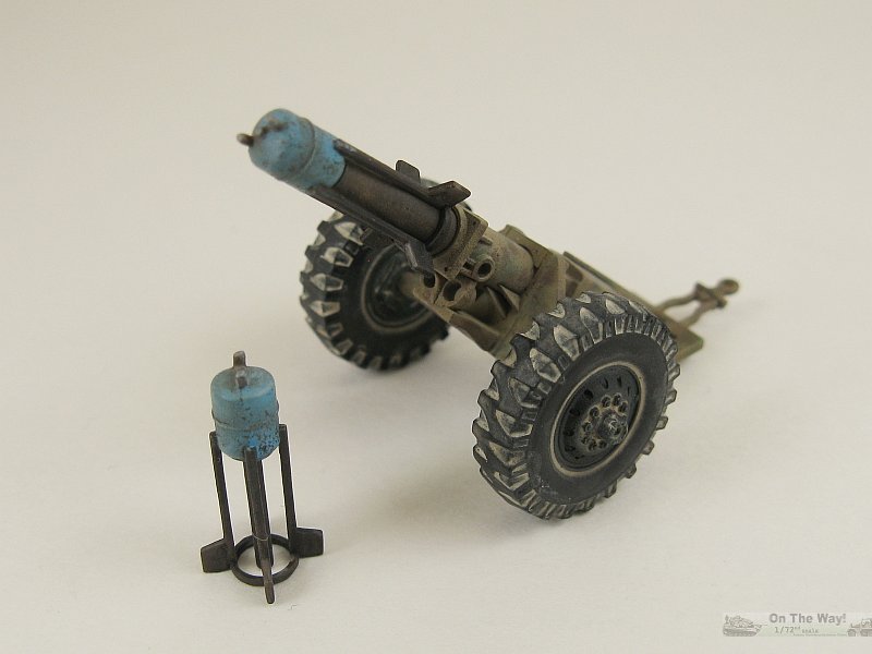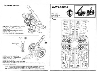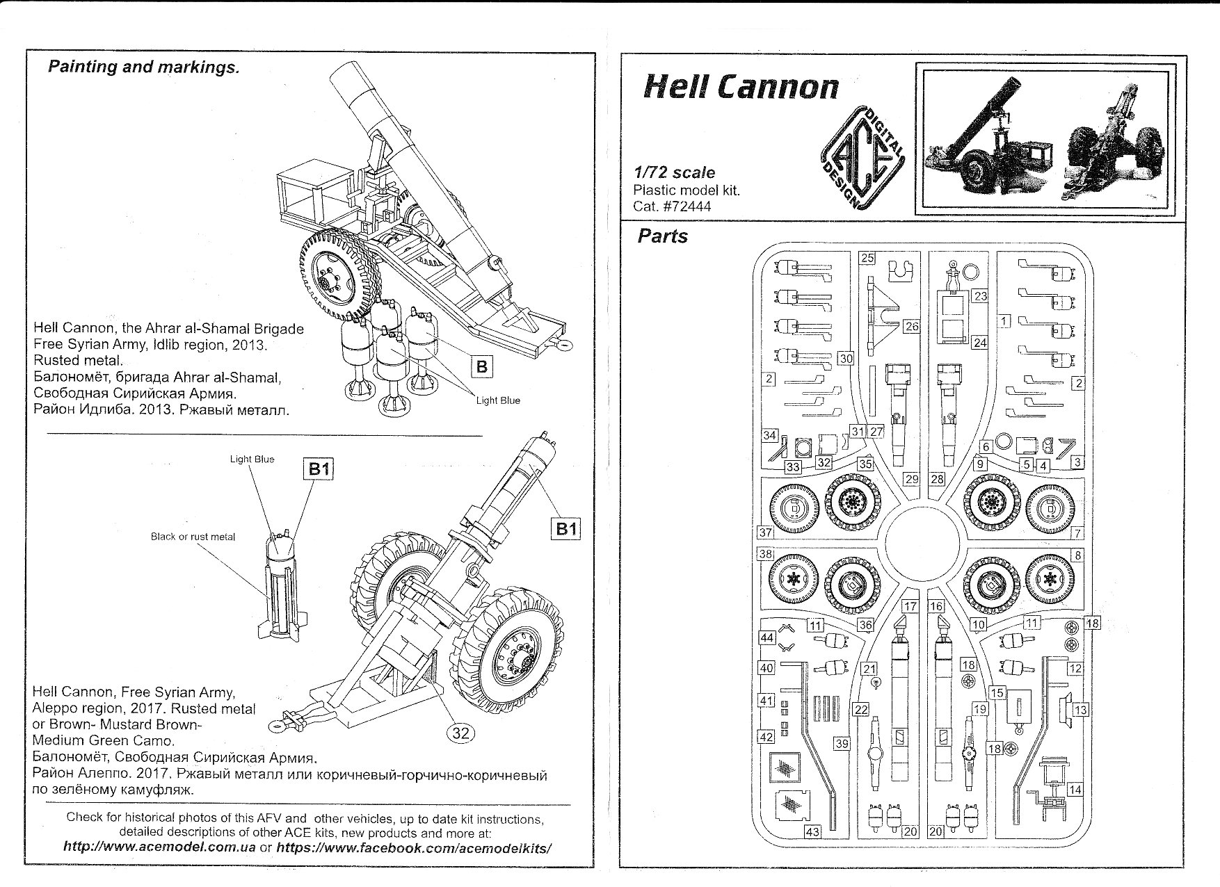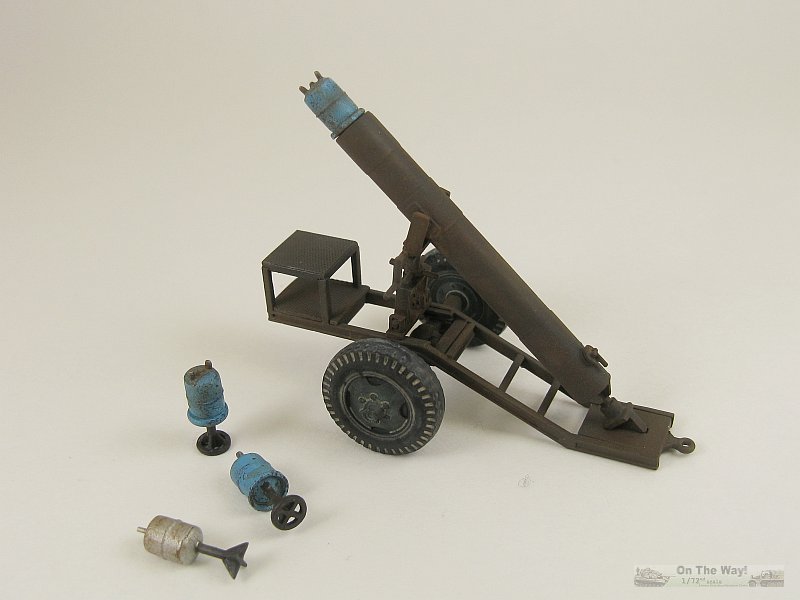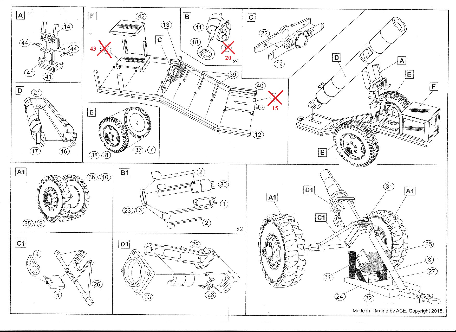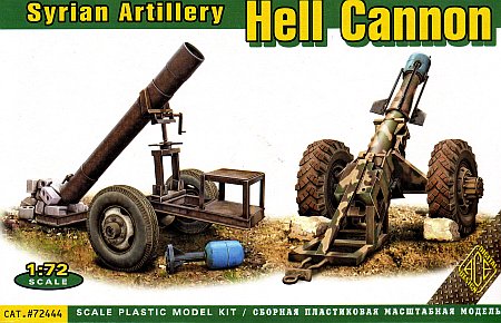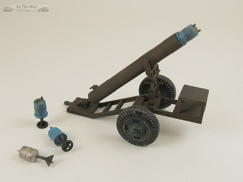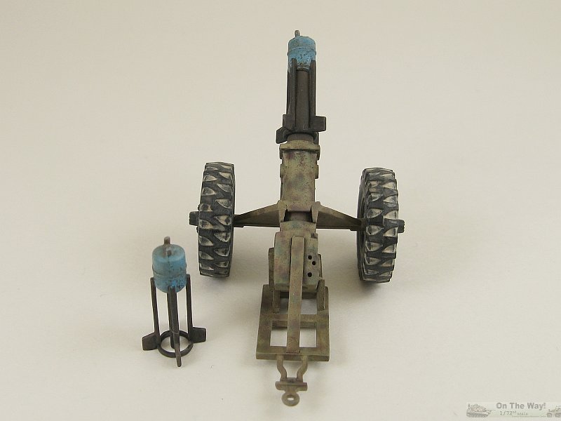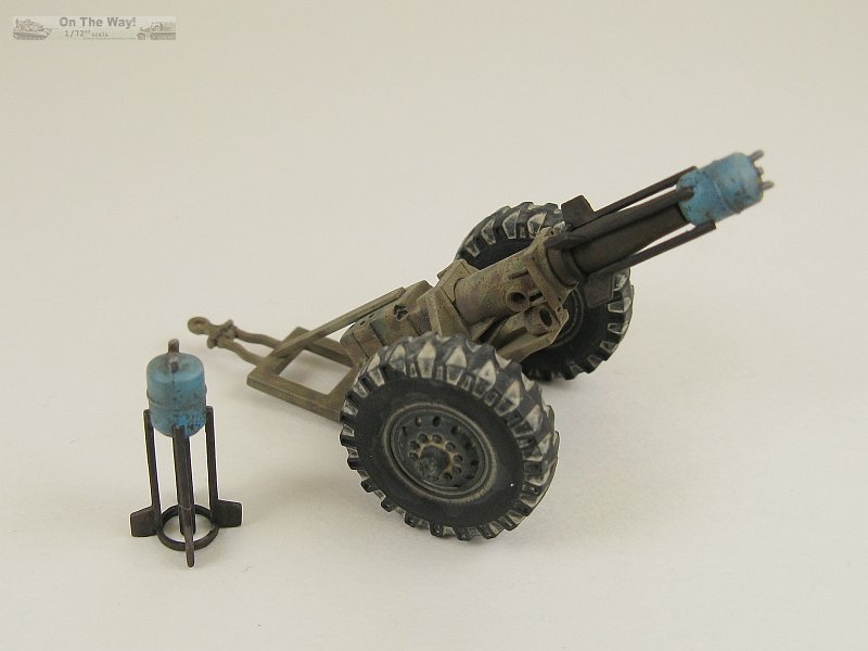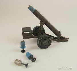 Inside the box you get one sprue of light grey, injected plastic, containing 72 parts for a pair of guns plus ammunition. One gun consists of 35 parts, while the remaining 37 parts are for the other gun. The moldings are relatively free of flash and I could find no ejector pin marks nor low points. The wheels for both guns are somewhat disappointing in their tire tread detail. Other than that, detail is quite good. There is a simple two sided instruction sheet, and obviously no decals. The gun with the platform under the muzzle (hereafter called gun type 1) has 7 construction steps. The other gun (hereafter called gun type 2) has 5 construction steps. Four of the externally finned projectiles are on the sprue but there are only 2 rings to cap their ends, thus the other two projectiles can not be completed. Some part numbers are misidentified in the instructions- Step B: Part 11 is actually part 20, Step F, part 41 is actually 43 and part 5 is actually 15. Construction Both guns were pretty much built straight out of the box. Both were built in sub-assemblies - four for gun type 1 (pair of wheels/tires, tube and carriage), three for gun type 2 (pair of wheels/tires plus a tube/carriage unit). Fit is very good all-round. The weld seam on all the ammunition was damaged after sanding the joints, so it was completely removed and replaced with stretched sprue modified to look like a weld seam. A nice feature of both guns is that the axles have rectangular mounting pegs that fit nicely into the corresponding slots in the wheels, making alignment just that much easier. Gun type 1 particulars The barrel for this gun is not quite circular in cross section following joining the two separate halves (parts 16 & 17). I didn't put any effort into hiding joint lines on the carriage, especially with the loaders platform, as this gun are very crudely built. For its ammunition I added missing circular bases to the cylinders using plastic tube pieces, cut and sanded to size. One of the cylinders was modified to have only a single fuse and by removing the circular ring at the end of the fins. Not wanting to fiddle with getting one of its projectiles to fit into the gun's muzzle I modified one by removing the fins and replacing them with a piece of round rod that fit the barrel snuggly. Once in place the rod was not visible. Gun type 2 particulars This gun is obviously constructed from a salvaged artillery piece, most likely Soviet/Russian in origin, though one that I can't identify. The trunnion hole on the right side was partly filled in, so it was deepened some with a drill bit. There are three holes on the top (probably from missing breech mechanisms) seen in the reference photos, so these too were added with a small drill bit. The kit is missing a couple of triangular supporting ribs just aft of the trunnion mounts which were fashioned from thin sheet plastic. For those with more skill than I, the thickish fins on its projectiles could be replaced with thinner versions. Painting Instruction specify a rusted metal finish for gun type 1. Ace's reference photos show a hint of green patches along with the rusty finish. For gun type 2, the instructions specify rusty or brown/mustard/green splotched finish. Ace's reference photo's show a combination - rusty fore barrel with a brown/mustard/green finish heavily weathered with dust and dirt. I followed the reference photos as closely as I could. As for painting the propane cylinders, pretty much anything goes, as long as it is within reason. Take a look at the pictures at the bottom of this page and you can see what I mean. I chose to paint most of them light blue, with one being done in silver. All of them were scratched up with dabs of burnt umber applied with small pieces of sponge, and a little dry brushing with a lighter shade of blue. Conclusion A very nice little offering from Ace. Simple to build, decent detail and unusual. The newer releases from Ace continue to improve over their older offerings. I can recommend this one highly.