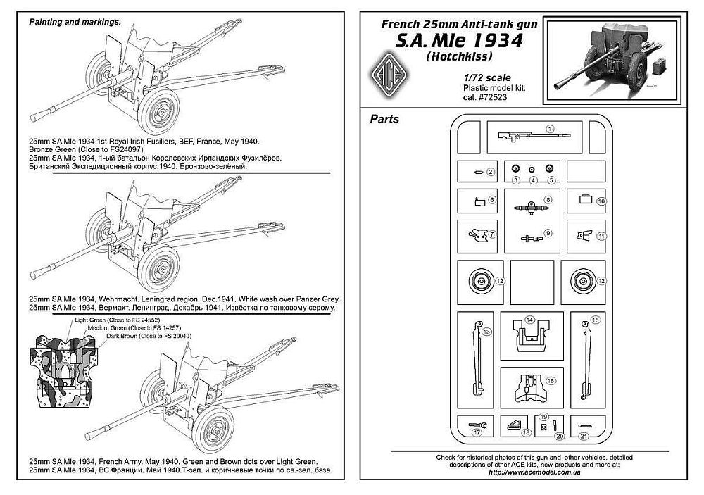 Suggested camouflage options are for: a three colour green & brown gun in French service, May 1940; a whitewash over panzer grey gun in Wehrmacht service, December 1941;