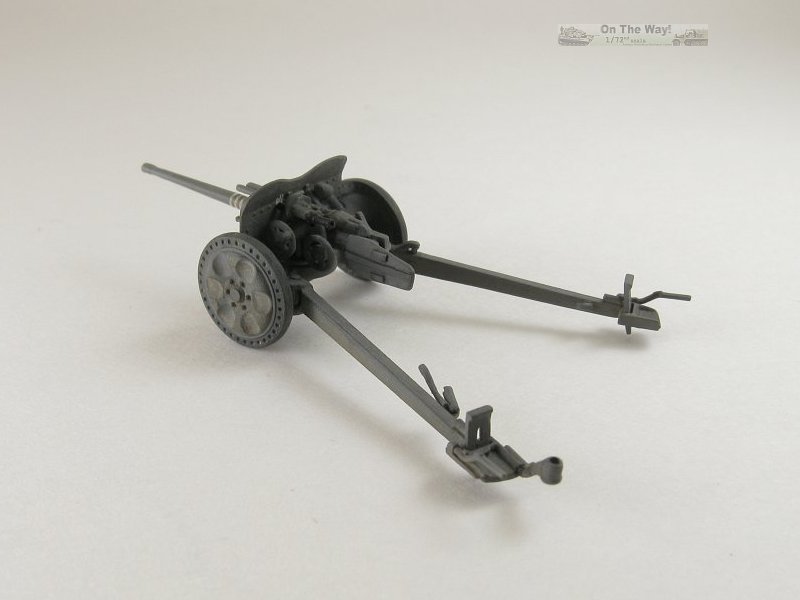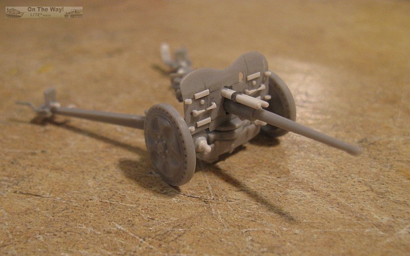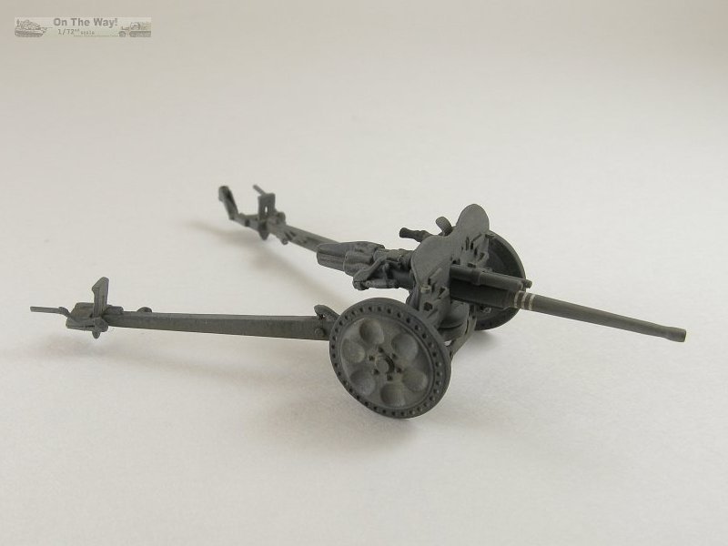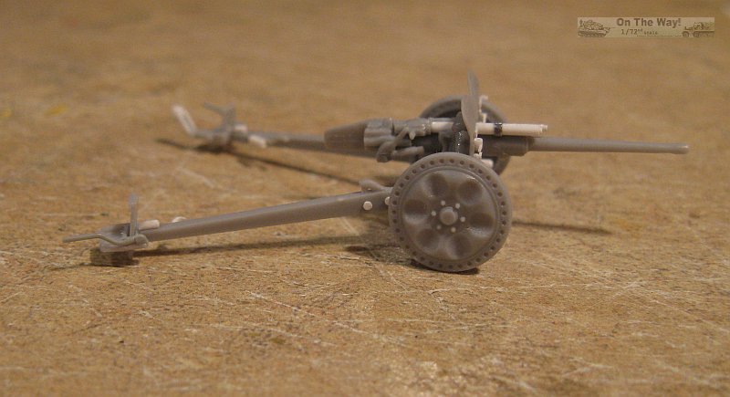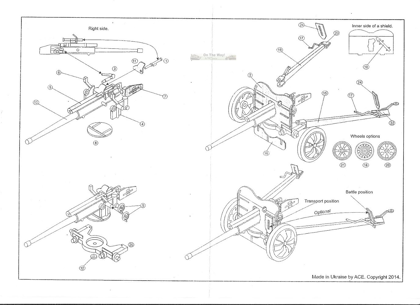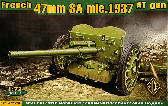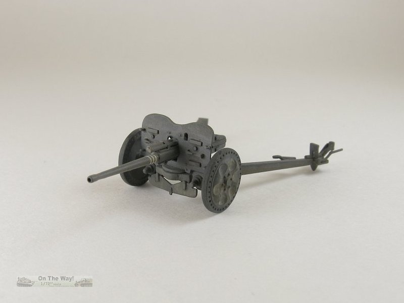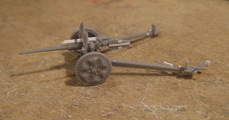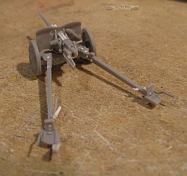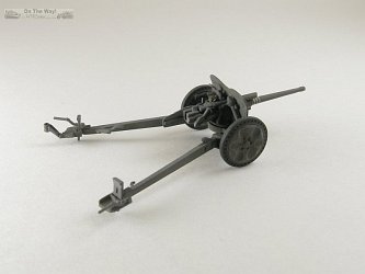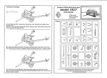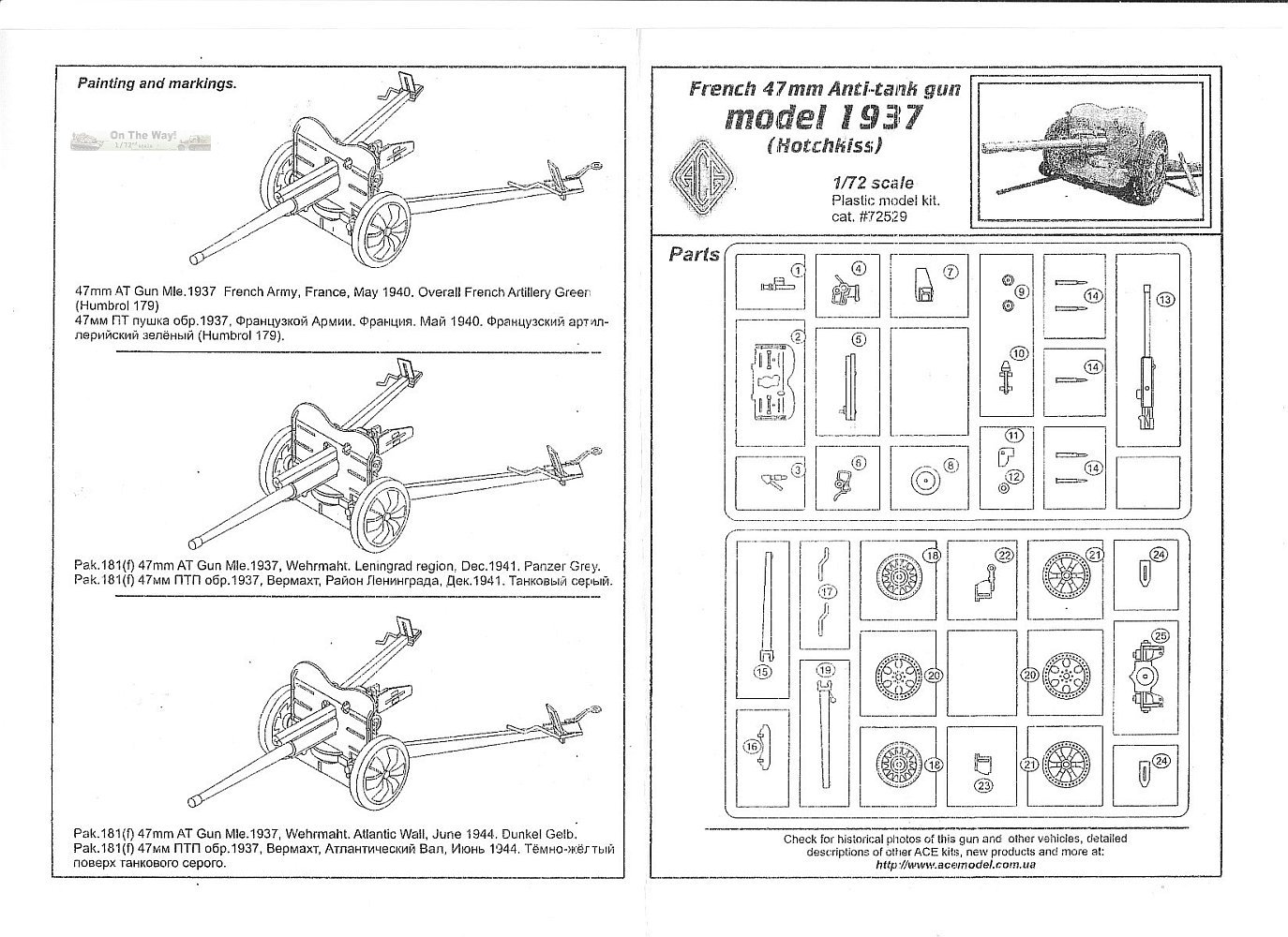A simple instruction sheet lays out 3 construction steps in the familiar exploded diagram format. Three camouflage options are given - one in French Army green, one in German Army panzer grey, and one in German Army panzer yellow. No decals are included. Pretty much every part needs scraping and/or sanding to get rid of seams and flaws. Test fitting is a must as parts fit is marginal. A low area on the face of the shield forced me to remove all the detail and sand the face flat. This work did have a benefit in the end, for the shield is now nice and thin versus what came in the box. New detail was added with pieces of plastic strip and rod. The rear side is devoid of detail outside of the demolition device (part 10). I added some rivets from one of the Archer Fine Transfers' rivet/fastener sets (Rivet Fastener Heads Rivets/Screws 0.011" (0.28mm) diameter, item no. AR88015) to both the front and rear faces. The kit's recoil cylinders on the top of the barrel were not very round so these were replaced with sections of plastic rod. Bolt heads on the ends were punched from plastic sheet and a strip of lead foil replicated the connecting brace. Unfortunately the barrel too exhibited an oval like profile. If there had been an aftermarket metal replacement I would have replaced it, but since I couldn't find one, I tried my best to round it out with sanding and scraping. The muzzle was drilled out. Minor low spots on the trails were eliminated with some scraping and sanding. Using my dial calipers, I made sure that both legs were the same dimensionally with additional scraping and sanding as required. Lost detail was added with discs punched from plastic sheet. Gussets were added to the towing eye. There were no pieces in the kit for the trail lock, so I added these as well. The underside of the carriage had deep sink holes that required filling and sanding. The handles that mount on the spades were replaced with a set from a Dragon Pak 40. Another low spot in the gun layer's protective shield again forced me to eliminate it with sanding and scraping. Destroyed detail was added with thin plastic strip. As for the wheels, of the three options, I chose part 20. These appeared to be the roundest and I didn't have to fiddle around with removing flash from between the spokes, as found on the other two wheel options. The other 2 pairs of wheels were assigned to the spares box. The backside of all three wheel versions are completely flat and devoid of detail. Reference [7] shows what the backside of wheel part 21 should look like for those wishing to tackle adding the missing ribs. The poorly molded aiming wheels (part 9) are best tossed in the trash. They are undersized and lack spokes. I found replacements in my parts box. I chose to camouflage my gun in panzer grey to represent a beute 4.7cm Pak 183(f). I added three kill rings from my decal spares box. Conclusion