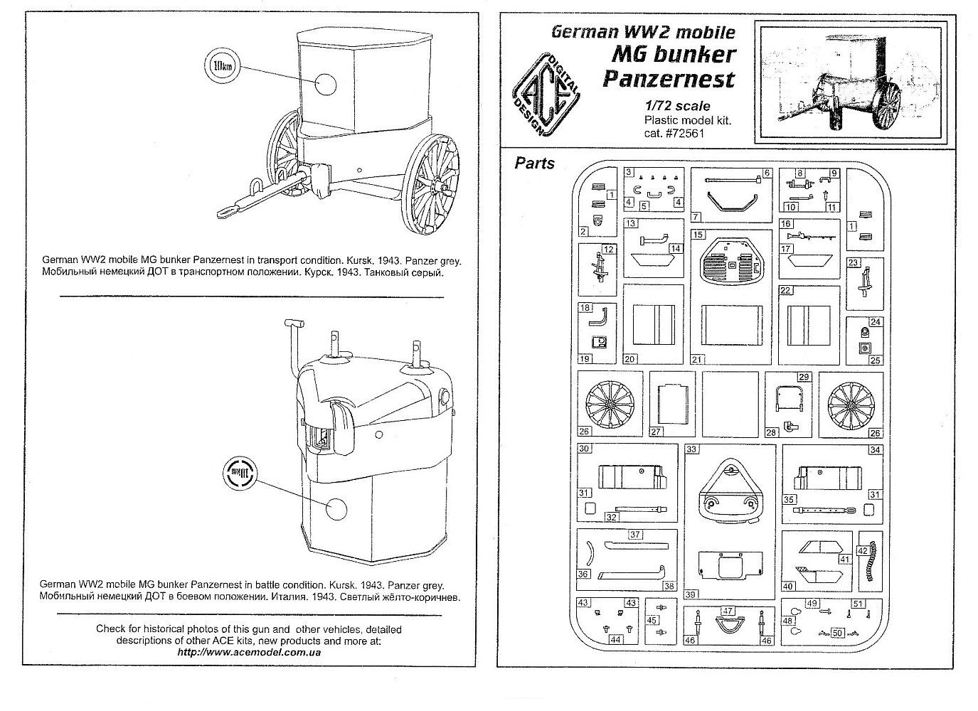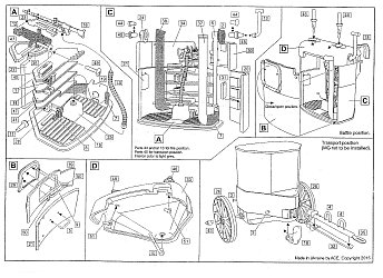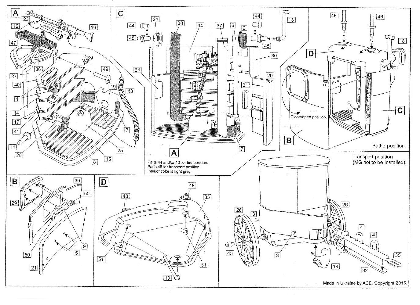 If the bunker is to be towed then use the axles (part 45) in place of the plugs, and add the towing tongue and wheels. The embrasure cover will have to be displaced