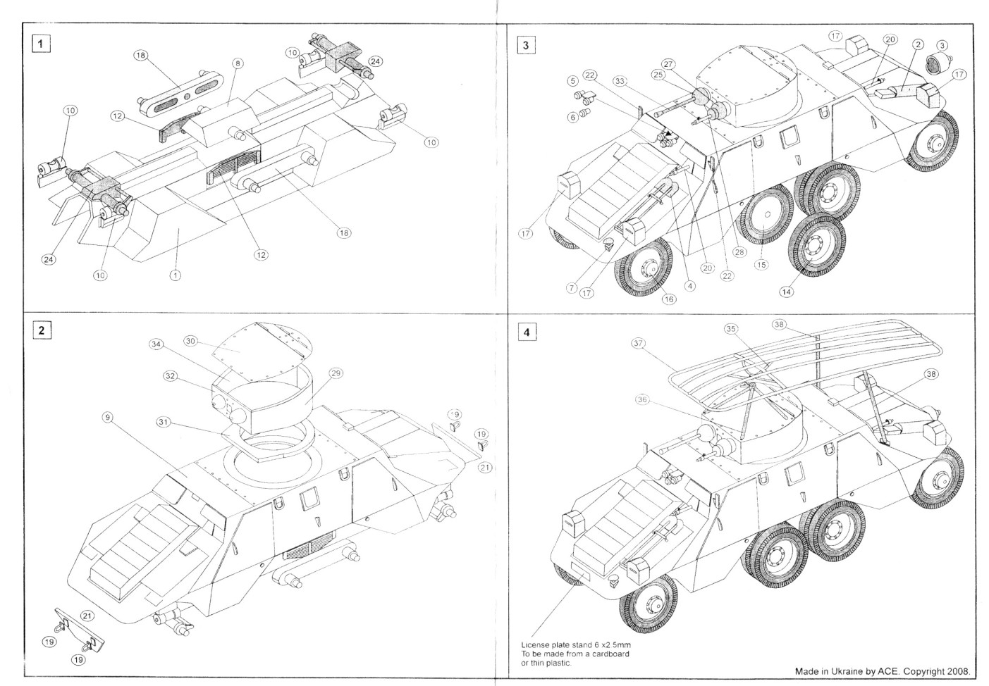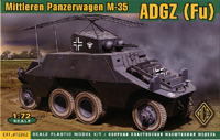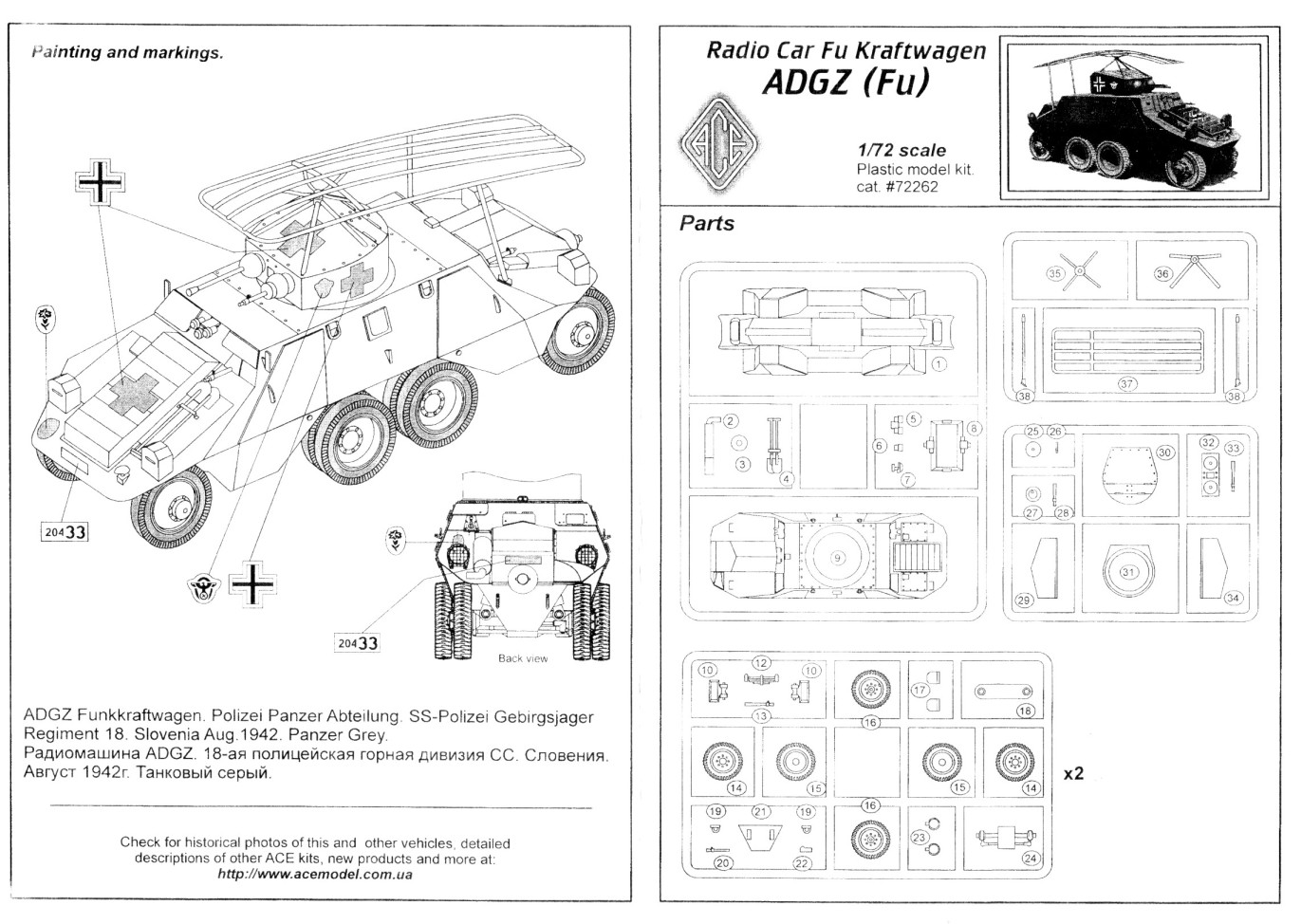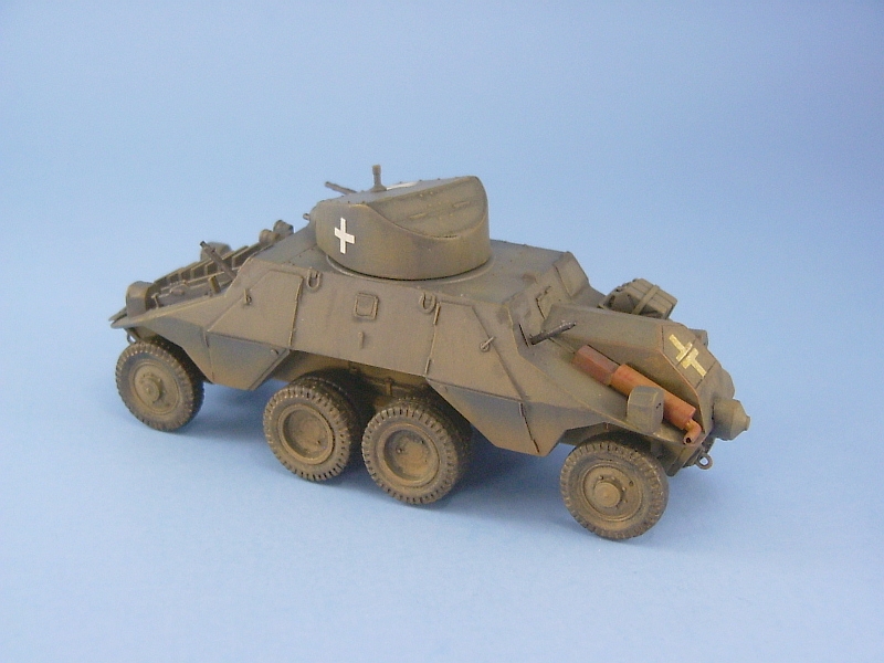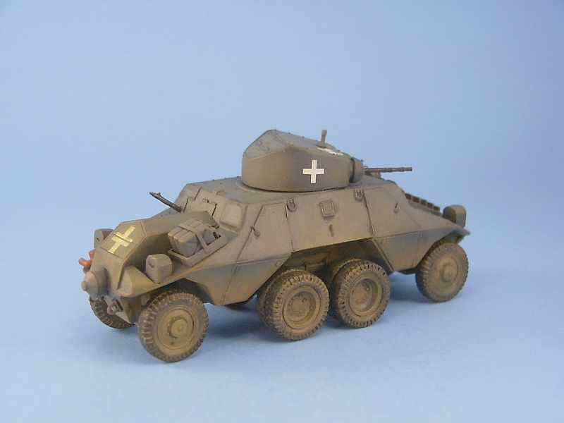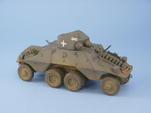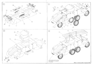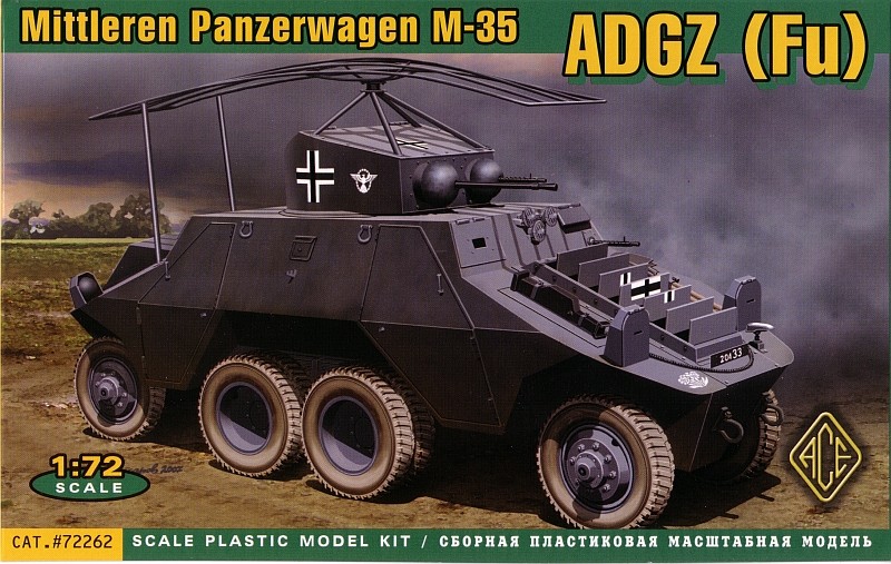 In the box you get 66 parts on five trees, molded in a soft light blue plastic. There is also an instruction sheet and a very tiny decal sheet. The molding is pretty rough and basic, typical of the vast majority of short run model offerings from Eastern Europe manufacturers. For the most part the pieces are useable but there is an obvious seam to be removed from almost every piece. The wheels are particularly poor and removing the seam will destroy what little tread pattern there is down the middle of the tires. On other parts removing the seam will flatten them out, such as on the wheel shafts. At least the soft light blue-grey plastic makes the cleanup task less difficult but it is very easy to break the thinner pieces such as the gun barrels, and the antenna frame supports. Parts fit is generally poor and you’ll spend the vast majority of your time cleaning up and doing test fitting. There are three areas that need special attention. First is the fit between the upper and lower portions of the body halves. Take extra time here and you’ll eliminate the need for major amounts of filling and sanding. Even after all my test fitting, I still needed some filling around all of the fender areas. The wheel opening at the lip where the top and bottom meet needs to be thinned also. The next concerns the middle set of dual wheels. The way the suspension is set up for these pretty much guarantees that they will not touch the ground. Some extra work is needed here to avoid this. The suspension arms for the wheels attach to a box like structure (part 8 – the transfer case maybe?) that attaches to the middle of the underside of the body. I kept the sanding of this box structure to a minimum so I wouldn’t reduce its height too much in an attempt to have it sit a bit closer to the ground than what it appears to be intended. When it came time to mount the wheels I did the corner wheels first and then the middle sets afterwards. Even my best effort here still required me to ream out the holes in the rims just a bit larger to allow the wheels to shift down a little to allow them to touch the ground. The last problem area is with the turret. Because it is made up of four parts – base, left and right sides, and top, which compounded with the poor fit, makes putting this together a challenge. I had to bend the top front of the turret to increase the slope to get a better fit with the sides. The markings are for ADGZ number 20433, of which I found four pictures on the web. I wanted to model an ADGZ that didn’t have the antenna frame as I much prefer the cleaner brutish look of the ADGZ without it. A search of the web produced two images of an ADGZ carrying the plain white crosses used during the German Polish campaign and decided to do my ADGZ in similar fashion. To get the look I wanted and to replicate the reference pictures as much as possible I performed the following modifications: 1. Sanded off the poor door handles that were