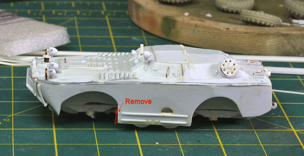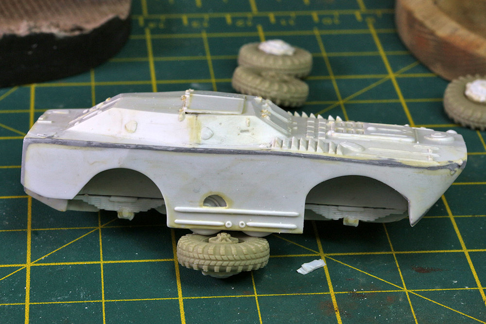 later. I have seen several reviews of the model over the years, and with few exceptions, the builders all complained about what a terrible kit it is. I won't sugar-coat anything; yes, this is a limited-run kit with all of the trials that go along with such, but considering the kit's accuracy and its high level of detail, not to mention that it's the only kit of the BRDM-1 to have ever been released in plastic, I think such complaints are unfair. If you buy a limited-run kit, then be prepared to build a limited-run kit. I have no complaints about the time spent cleaning up roughly molded parts and scratch-building replacements for some of the more delicate details. This was one of ACE's earliest releases; I think that at one point the kit may have been re-released with rubber tires to replace the original plastic ones, but I can't recall for certain. Regardless, it is long out of production and no longer in the ACE catalogue. For me, the weakest part of the kit were the tires. Not only do the wheels have too small of a diameter, but the tread pattern is nonexistant on the surface due to molding limitations. However, I had bought a set of replacement wheels from Tankograd that are labeled for both the BRDM-1 and BRDM-2. But my research has shown that the BRDM-2 tires had a slightly larger diameter than the BRDM-1, and the size of the resin wheels was more appropriate for the larger vehicle. Thus, the wheels are slightly too large for this model, though it's not really apparent. I did have to enlarge the front wheel well openings a small amount, but I would have done that anyway, as the shape was just a little bit off. I have no idea why, but I did not take photos of the Tankograd resin wheels during construction, but you can see them in the following photo: The Tankograd wheels are really quite beautiful. The wheel hubs come separate from the tires, and I had to do a little bit of carving to enlarge the opening in the tires so that the hubs could fit. But otherwise, they have a gorgeous tread pattern, and the wheel hubs are very finely detailed. However, they were not designed for this specific kit, so that in order to make them fit properly onto the axles in the wheel wells, I glued the plastic kit parts #4 to the insides of the wheel hubs, as can be seen on the wheels in the background in the above photo. I do not know if these wheels are still available for purchase. I cannot find a website for Tankograd, and Tracks & Troops no longer has this item listed in their catalogue. In the following photo you can see the extensive puttying I had to do to make all of the hull edges and corner square. I used several different putties over the years, hence the different colors. The photo also shows an area of the hull side to the rear of the front wheel well that had excess material on it, forming an angle that needed to be removed so that it was a straight line perpendicular to the ground. Removing this wedge of plastic also helped the slightly overlarge Tankograd wheels fit better into the wheel well. The hinged, mechanical arms that swing the front water splash plate upwards were much too long to attach properly, but were easy enough to shorten. The following photo shows a small correction to make to the right side (only) of the fighting compartment. When I was trying to attach the long crowbar to the hull deck, it wouldn't fit alongside the fighting compartment. I looked at walk-around photos online and saw that there was a small notch cut out of the corner of the fighting compartment that allowed space for the crowbar (and a tow cable, not added here) to fit alongside the hull. It was quick work with a file and sandpaper to craft this notch so that everything then fit properly. You can see in these pre-construction photos that I scratch-built a number of the smaller details, such as the headlight brush guards, the winch guides on the nose and rear of the hull, the machinegun mount, the crowbar, and a couple other items. Unfortunately, it's hard to make out what I scratched because the styrene plastic I used was the same color as the kit parts. The forward and rear towhooks in the kit have the wrong shape for this vehicle. Since I didn't have any replacements, I used a file and sandpaper in an attempt to reshape the kit parts, but was not entirely successful. Also, in retrospect, I attached them upside down. Here is a simple tip: when having to clean up very small parts, too small to adequately hold in one's fingers while grinding and sanding, I find it easier to clip a section of the sprue, leaving the part still attached, so that I can hang on to a larger piece of plastic while doing most of the clean-up work. When finished, I snip it off the sprue, clean that last little bit of sprue attachment point, and voilą! For some parts like headlights, I finish sanding off the sprue attachement after the part is already attached to the hull, if the attachment is strong enough (as with super glue). I have no idea what the underside of this vehicle should look like; I imagine it's something like this. Suffice it to say, there was a bit of grinding and sanding to locate the axles in the proper place within the wheel wells. Unfotunately, my eyeball was not good enough to get the front and rear axles level with each other. The completed model looks as though the rear end is jacked up a small amount. It's not too terrible, but it was a rookie mistake nonetheless. In the Preview for this kit, I had stated that the four auxiliary wheels in the center of the hull could be posed retracted (as pictured) or extended. I'm not sure why I said that because to pose them extended would take a bit of carving and resculpting to accomplish. But it could be done if one wanted it badly enough. I will admit here to not putting a lot of effort into cleaning up the underside parts, as I plan to secure this vehicle to a display base at some point, so the undercarriage won't be visible. And here is where we get to my disappo