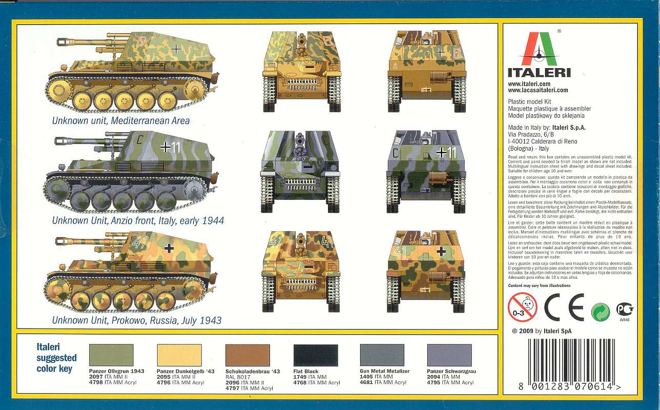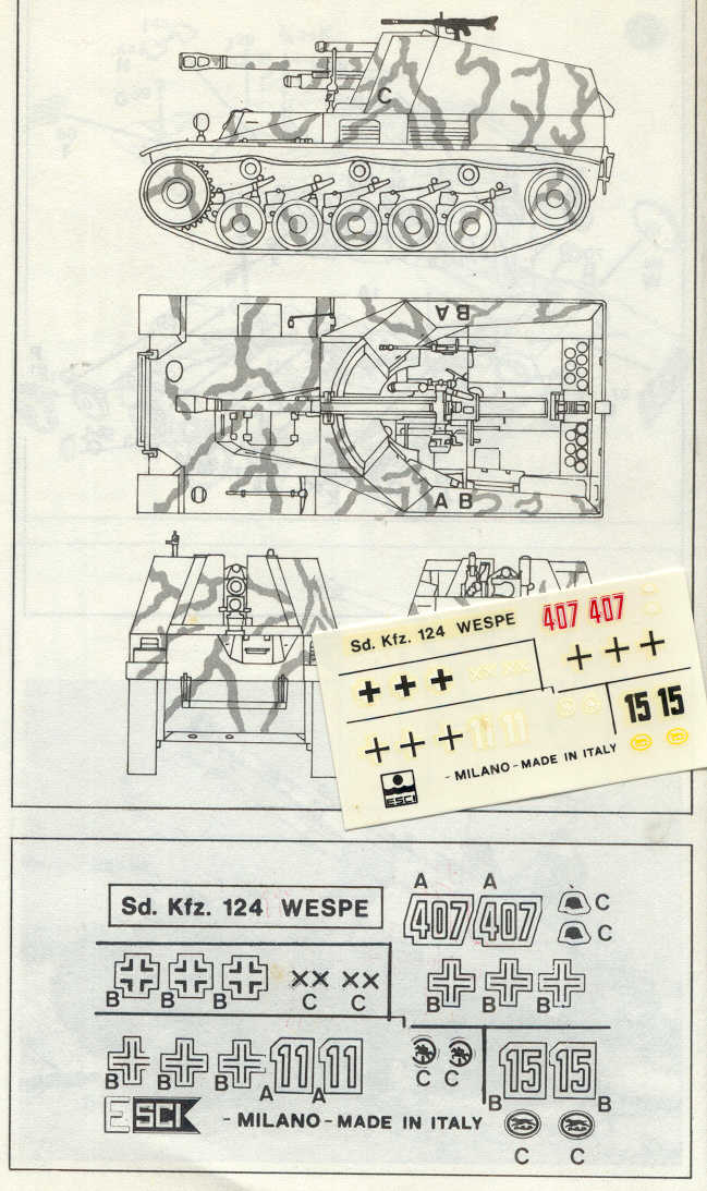 by Italeri. The boxart for the Italeri 1/72-scale Wespe model kit 7061 shows a photo of the actual competently built and handsomely painted model. From the top we see the open superstructure resembling that used by the Marder Panzerjäger series. On the glacis is a spare roadwheel which is a standard location for the spare wheel on the Pz II. At the rear of the port side visible here is a storage rack that is not typical for the Wespe. From the drape of the track over the wheels and lack of track guide teeth, this appears to be the dreadful stiff polyethylene plastic track common to many old ESCI model kits; note the lack of track sag. One of two crew figures is visible in the driver’s hatch. Italeri finished the model with a nice 3-color soft edge camouflage. The only markings are some unit emblems at the portside rear. The builder appears to have drilled out the muzzle. Boxart for ESCI kit 8004 shows an accurate representation of a Wespe in what looks like a cold day, and with a Nebelwerfer barrage launching at the far-left background. At the rear portside corner we see the storage rack made from narrower metal strapping than the model kit represents. The vehicle is finished in what appears to be dark gray with a winter whitewash. Markings are a red vehicle number and a white helmet marking indicating this Wespe is with the Panzergrenadier Division "Großdeutschland” on the Eastern Front. The boxart for the 1/72-scale ACE Wespe kit 72295 shows the same port side as the above two boxart. The artwork looks accurate and the paint scheme and markings very well done. This is a good view of the wheels and leaf-spring suspension. I am curious if the leaf-springs were actually painted black. Note the engine vents here on the port side under the gun mount. The rear of the Italeri box shows a color painting guide with 3-view drawings of three different Wespe vehicles. The paint scheme and markings of these three Wespe do not match the vehicle on the front of the Italeri or the ESCI boxes. Since the Wespe was in production from early 1943 we can find it in dark gray, or in panzer yellow and camouflage colors. Kit