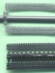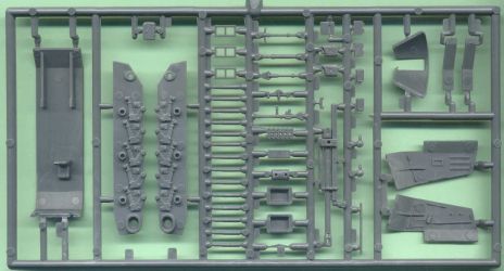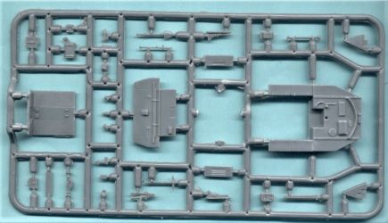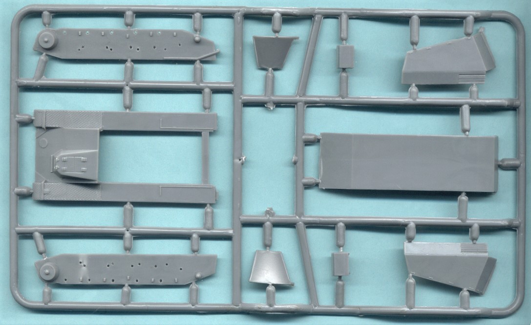 Parts Photos of the sprue above and below show the sharp molding of the ESCI/Italeri model kit despite its 20+ year old molds. Note that the driver’s hatch may be modeled open. The leaf spring suspension is molded onto the lower hull sides (parts-3 and 4). Top center are the howitzer carriage parts-75 & 76. Bottom center is one of the two crew figures; the 2nd crew figure is missing from the sprue, so see the sprue photos at Henk of Holland website (https://henk.fox3000.com/italeri/7061/09.jpg) to see the complete sprue. Be aware that the gun rounds (parts 5 thru 18) in the center of the sprue below don’t look to be correct for a 10.5-cm leFH18, as these look more like the 7.5-cm fixed rounds used in the StuK 40 and KwK 40 guns used in the StuG III and Pz IV respectively. The muzzle brake for the ESCI kit howitzer (part 33) may be drilled out to improve detail (no slide molding for this 30-year old kit?). The ACE Models Wespe model is similar to the ESCI/Italeri parts and how they go together; a main difference is the increased number of parts for the leFH18 howitzer and the suspension being separate parts and not molded onto the hull side. In the sprue photo below, we see the correct size 10.5-cm howitzer shells and cases (parts 70 & 71) at far left. The howitzer muzzle brake is in two parts so we should not have to drill out the muzzle. The ACE Models 10.5-cm leFH18 includes a gunsight (part-52) and more realistic shells and shell cases (parts 70 and 71) that are missing from the ESCI/Italeri model kit. The ACE Wespe model includes a greater number of interior parts and superior detail shown in the sprue above. The sprue of the ACE kit wheels below is the same as in ACE Panzer II model kits. ACE gives us two choices of idler wheels (parts 18 or 19), and separate right-side and left-side leaf spring bogies (parts 15 & 16). The separate bogies allow to more easily change them to model the roadwheels over irregular ground. The flexible black plastic band track from the ACE kit eclipses the stiff silver color polyethylene plastic track in my ESCI kit. The ACE track can be joined with super glue and I have read that the track should be painted with primer to curb a bad reaction with the styrene plastic wheels. I recommend the ESCI track be softened in hot water to bend it around the wheels, then use special super glue with a tube of activator to fasten the polyethylene plastic track ends together and to affix the track to the wheels. To significantly improve either the ESCI or the ACE Wespe of Pz II smallscale model I recommend the aftermarket cast resin tracks and wheels from OKB Grigorov, shown at the top of this photo, or from other aftermarket suppliers. Lower right is the ESCI/Italeri track. (At lower left is the Attack Models Pz II kit styrene band track, wheels and leaf spring bogies for comparison.)