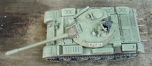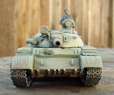 I painted the model in AeroMaster acrylic paints. The markings in the kit are very well printed, and from prior experience, are very good decals. But I wanted to take this opportunity to review a second product at the same time, so I chose to use some decals from YnoT instead. The markings I used represent a Polish T-55 of an unknown unit in the mid-1970's. But I think I may have made a mistake in my choice of markings. After completing the model, I've seen that Polish-built T-55's had a storage box on the left front face of the turret, with the vehicle number on top of the box. I didn't take the time to replicate this box, and put the number right on the turret face, but I think that perhaps ALL Polish tanks had this box, so my markings may therefore be wrong. Additionally, I don't know if Polish T-55's had the snorkel stowed on the right side of the turret, so again, the inclusion of this part may be incorrect for a Polish tank. Regarding the scale of the kit, according to my references, it as exactly 1/72nd.