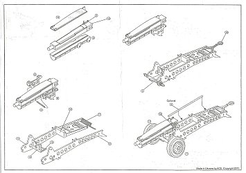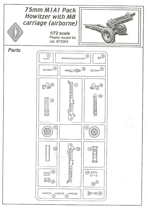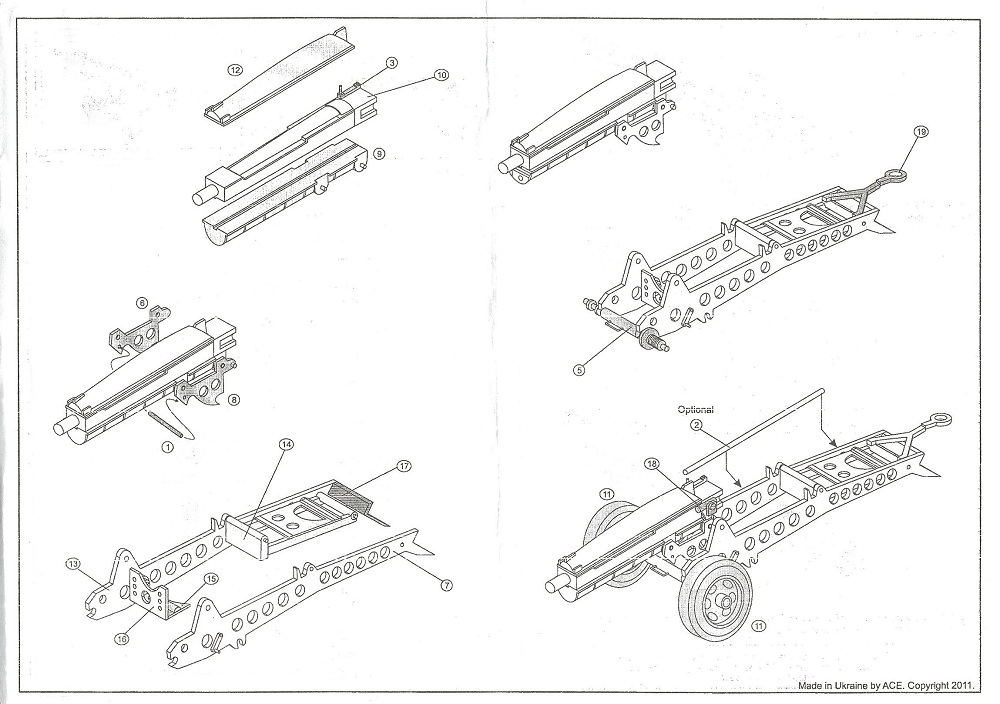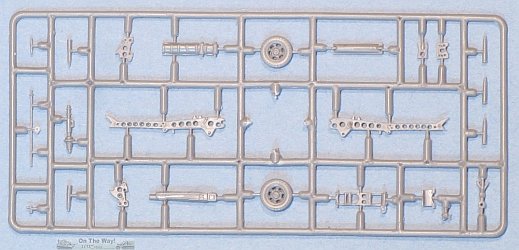Inside ACE's standard sized and colourfully illustrated box, one finds a single small sprue of 24 grey injection moulded parts. Though obviously produced by a limited run process, I was generally impressed by the level of detail on the parts. Some flash is evident, and most of the lightening holes in the trail and mount will require cleaning out. The trail parts also show some shallow sink marks.