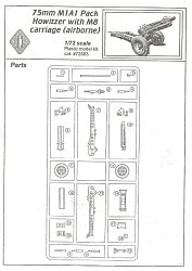 Assembly looks relatively straightforward, though all the parts will need some careful clean-up. There's plenty of room for detailing, and the box art shows some details not captured in the kit, such as the recoil springs located inside the hollow trail arms, the open lifting lugs on the top barrel sleigh, and the lifting eye near the end of the barrel. Looking carefully at the box art, one can make out rifling in the mouth of the barrel - this is not correct. The end of the barrel is actually a hollow sleeve, with muzzle of the rifled barrel actually located several inches into the sleeve. Something to bear in mind if drilling out the barrel. A nice touch is the inclusion of five 75 mm shells.