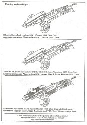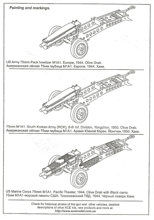 Instructions consist of a parts diagram, five exploded-view diagrams, and a painting diagram. Three schemes are illustrated - US Army, Europe 1944 in overall olive drab, 8th Infantry Division, South Korean Army, Yongchon 1950, also in overall olive drab, and US Marine Corps, Pacific theatre 1944, in olive drab with black camo. No decals are provided.