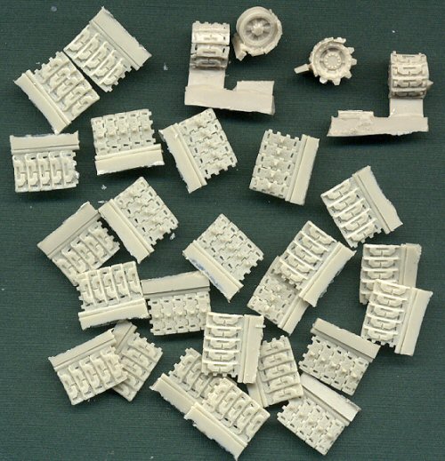 This set includes replacement idler and sprocketed drive wheels, with several lengths of track links. The wheels have the track already wrapped around them, taking care of the problem of bending the resin parts to such an extreme angle. The other track pieces can be bent slightly as needed to help replicate realistic track sag. I would have been happy to have only mediocre track replacements, since the Heller parts are so bad, but these resin tracks are not mediocre, they are excellent. Not only is this set highly recommended for the Heller kit, but in fact it is necessary, unless you want to scratchbuild these tracks yourself. |