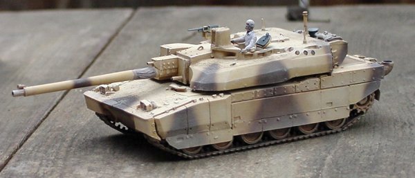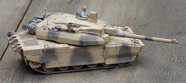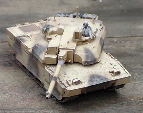 What I have painted, in fact, represents a French Leclerc on maneuvers in Qatar. It turns out that the UAE tanks have a very large number of very obvious differences from the French tanks. Even more than I imagined. While building my tank, I had seen photographs of tanks with two different "desert" paint schemes. I had incorrectly assumed that the solid yellow scheme was early UAE tanks, and the camouflaged version (which I painted) was a late UAE tank. In reality, the UAE tanks are the solid yellow ones, and like I said, have many obvious external differences from the French tanks. The paint scheme I used is for the French tanks in Qatar.
