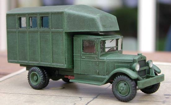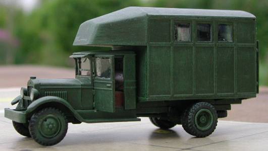 The main body parts form one sprue; you only need to cut off parts, clean them up, glue them together and you are finished. I had no references regarding an interior, so this was omitted but I did fix some windows. The rear door received a door handle. The complete truck was painted Russian green followed by a dry brushing of the green with some white added. All this was followed by a coat of Klir (Future) and Clear Cote over the windows. Conclusion: