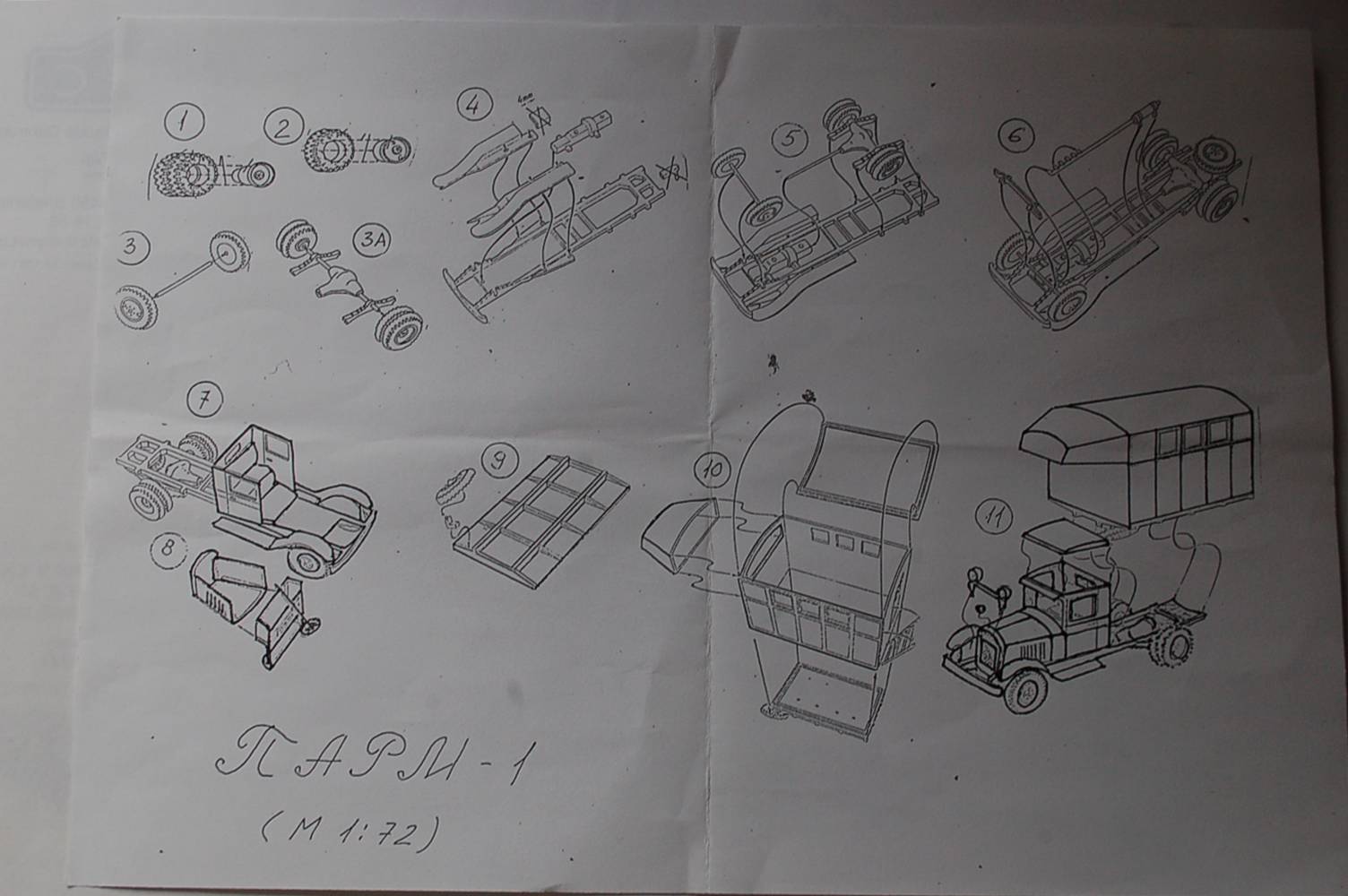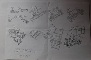 of the main truck. Well thought through. There already exists a version of the Parm 2 by the same company. Note that the figure behind "Parm" refers to the amount of rear axles: the Parm 1 had only one rear axle with double wheels and a box-like type of rear compartment with a cabin overhang. You can look at it as a forerunner of the shelters we know now of these days. Wood construction was used to save metal. The construction layout can be called very simple and it all starts with the construction of the axles. I started with the cleaning-up of the tyres and the separate rims. These are highly commended because it allows you to paint tyres and rims in a much cleaner way. The axles are problematic. After being released from the sprue and after cleaning-up, I noticed that none of the 3 metal axles provided in the kit were long enough to be used with either the front or the rear axle. The rear axle also needs to be inserted through the differential gear and through both leaf spring axles before being able to accept both wheel rims. So, the provided metal axles needed to be replaced by other metal parts. It adds strength to the unit but requires some adjusting. The drive shaft between engine and differential was also replaced by a metal one. The exhaust was drilled out. Construction of the main body was simple and