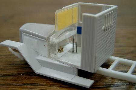 • construction of a metal frame to be placed in front of the window, which serves as a mount for the searchlight, provided amongst the small resin parts. This light needs to be drilled out, to be painted silver on the interior and to finally receive a drop of Kristal Klear as glass.
