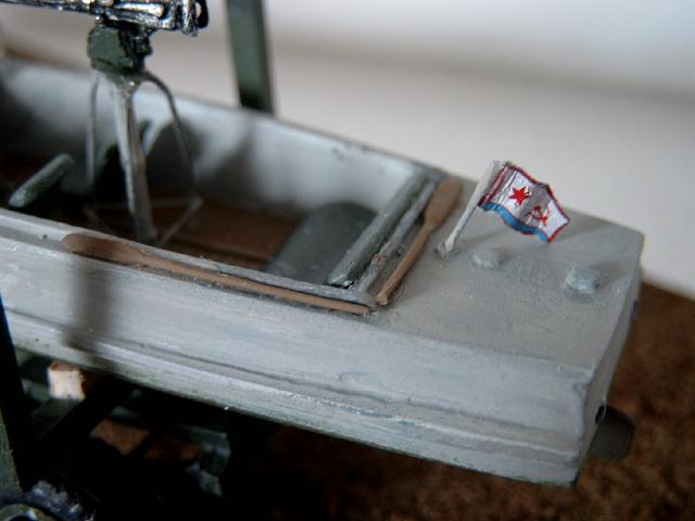 • drilling out a small hole on the rear deck in order to receive a small flagpole made from metal wire. Construction of a flag made from lead sheet (wine bottle) and decals.
