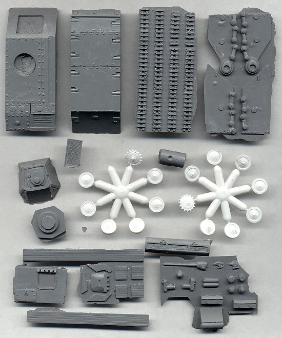 This is pretty much the best AER resin kit I have seen yet. It is a definite improvement over their earlier kits, with higher quality resin, better casting technique, and better master parts. As you can see in the scan, the wheels are actually molded in plastic, and they are very well done. I do not know why they did not mold the entire kit in plastic. There is some warping in the hull sides, behind the chassis, but that is pretty much the only molding defect I have seen. The turret hatch is molded shut, but the front driver's view-hatch is open. There is some thin flash blocking the openings in the upper hull; the hull is not molded solid. There are more track pieces included, which are not shown in the scan. They look like copies of ESCI's Pz. I tracks. The outer surfaces are pretty well-detailed, but the inner surfaces are smooth.