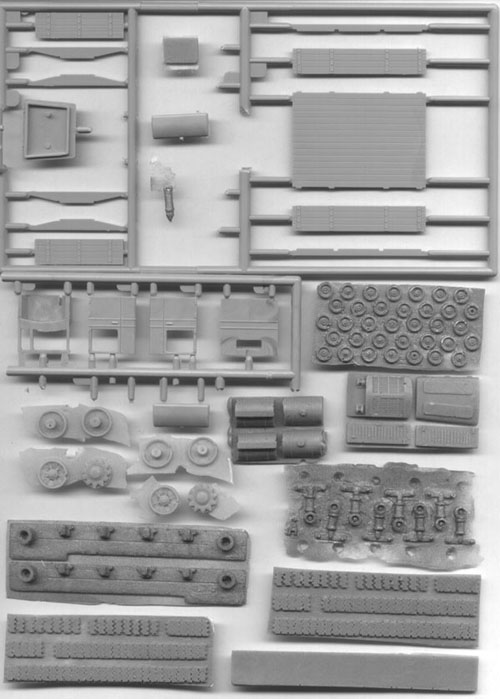 There were three types of resin used, including some wierd silvery stuff, which may actually be some sort of plastic. But none of the resin held the detail very well. All the parts are plagued with an abundance of bubbles and air pockets. Of the 53 wheels included in my example, only 14 of them are useable (you need 32, although half of them may be hidden on the inside of the wheel assemblies. One of the sprocket wheels, and three of the idler wheels are also ruined. The tracks are very bad. They have a good shape to them, but there is absolutely no detail on them, and removing them from their backing would be very difficult. The instructions are mediocre. If someone has good reference material for this tractor, perhaps this kit could be salvaged as a scratch-build project, but the tracks will be very difficult to overcome.