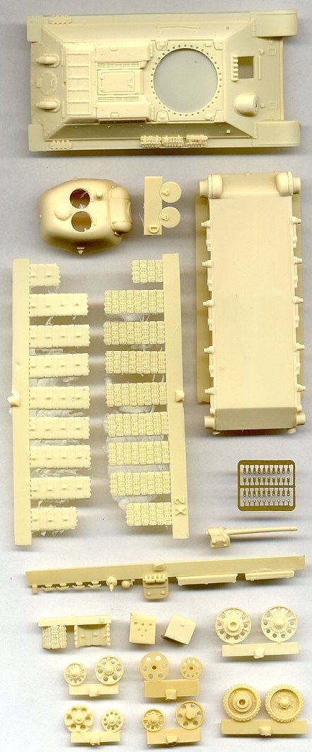 The base for the kit is the out-of-production ESCI T-34 kit. Al.By made some minor modifications to the ESCI hull, which improves the final product considerably. Some of the changes include the addition of spare track links to the fenders, some handholds on the engine access hatches, nicer mufflers, and the removal of the storage boxes and equipment tie-downs from the hull side. The lower hull is also copied from ESCI, but the wheel axles have been greatly improved, and better detail added to the sides of the lower hull. As far as I can tell, the only other copied ESCI parts are the tow shackles, the gun, the tracks, and the storage boxes (but as separate parts).