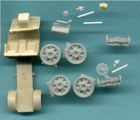 The kit consists of 15 resin parts and 48 etched brass parts on two frets. Casting is very well done and the brass is etched very well also. The cargo bed and storage boxes are assembled from etched brass. Brass gear shifts and foot pedals are included and I found detail to be overall excellent. Clean-up appears to be simple as well.