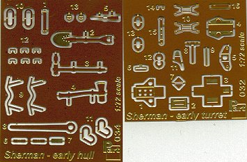 As for the other kit parts, a very nice turned aluminum gun barrel is included (but it doesn't fit into the mantlet), and the photoetched parts are done by PART, and with the exception of all the brass wasted on the pioneer tools, there are many useful pieces here. I certainly hope that ARMO will market the gun barrel separately, since as of this writing, the only 75mm Sherman barrel they offer is designed for the Airfix Sherman kit, and is very underscale.
