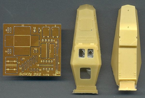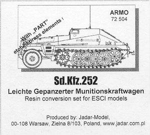 I have long wanted a kit of this vehicle (as well as the Sd.Kfz. 253), and until now, the only available kits were from Al.By, which I have not yet seen. But now, ARMO has given us conversion sets for both of these half-tracks, meant to be used with the ESCI Sd.Kfz. 250. In fact, this 252 kit (and I assume the 253 as well) is based upon a highly modified ESCI 250 hull. To complete the model, the chassis, wheels and other external details are needed from the ESCI kit.