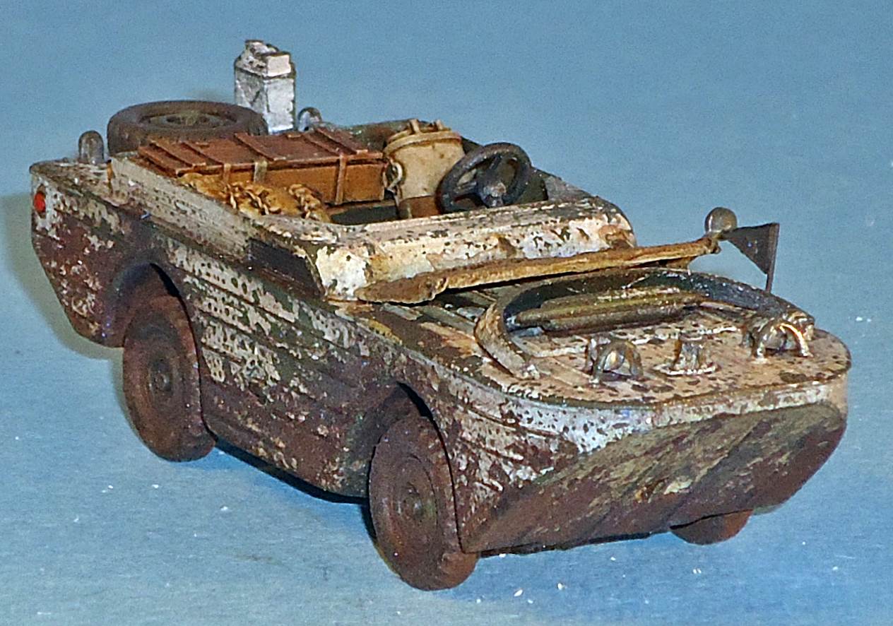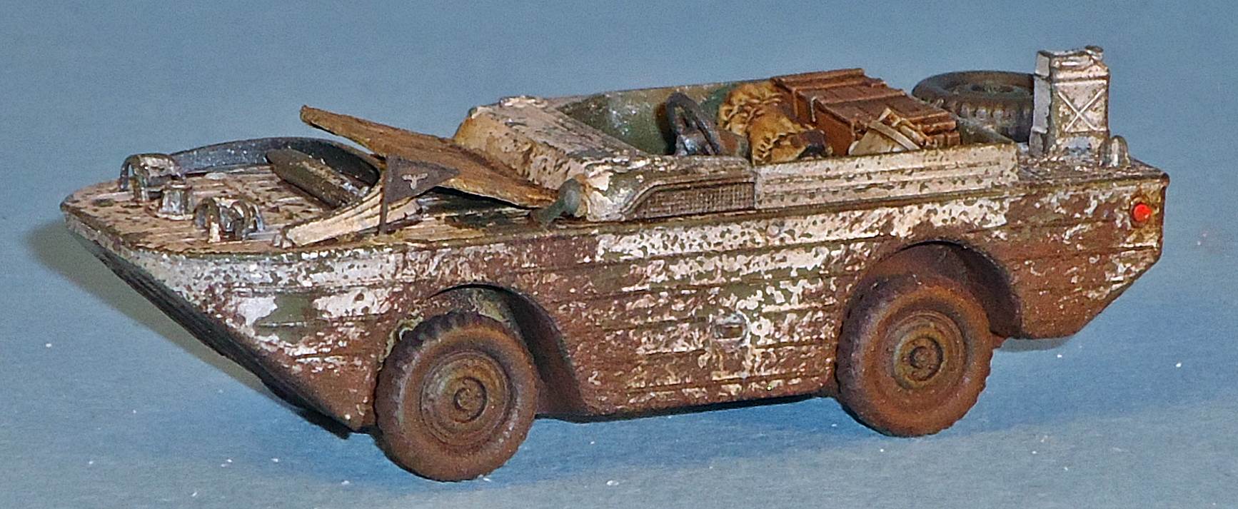 Wanting to depict the vehicle seen here, I added a dent to the left side of the nose. This was done by thinning the inside of the hull and then pushing a blunt tool into the nose. A command pennant (recovered from an Eduard detail set for the Schwimmwagen) was added.