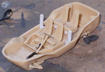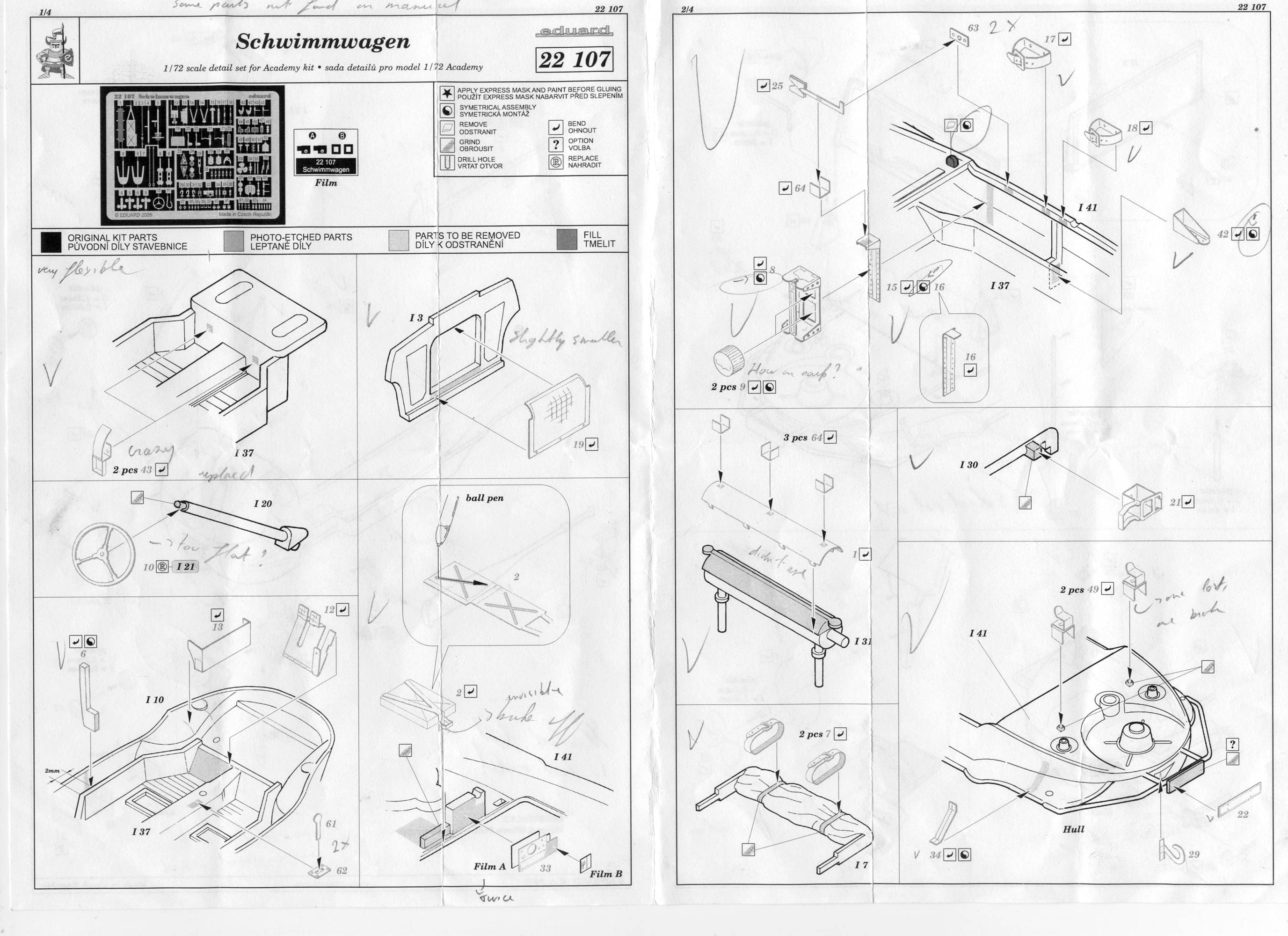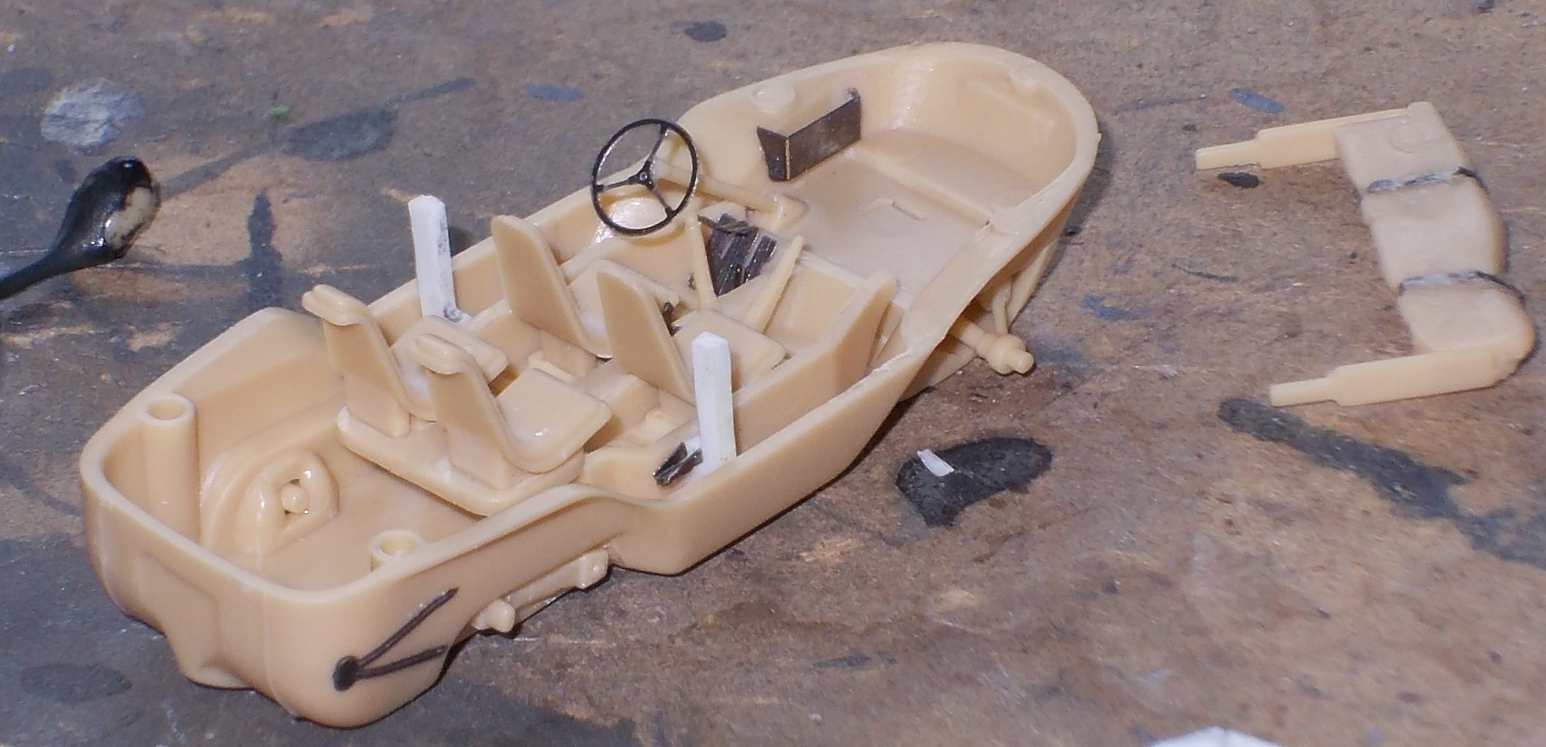 Construction Construction of the Academy kit starts with the lower hull. I only followed the instructions to a limited extent. For instance, I left off the wheels until the very end. Afterwards the instructions of the Academy kit turn to the "tub" which is provided for the interior. While rather good in itself, this was the first step in which I used the Eduard parts. My first attempt was rather inauspicious, as I broke one of the interior fittings that go to the rear of the tub and lost the other. Breaking the PE parts is rather a common occurrence due to the fineness of the parts and the multiple fold lines (6 for this part that is barely 1mm across). Fortunately these two parts will be mostly hidden underneath the rear seats, so I trusted my limited scratchbuilding skills to come up with something similar. While on the subject of these rear seats: you might want to cut them down by a couple of milimeters, or sand down their base, as they will interfere with the (folded) hood. Either Academy messed up the fit of these parts, or I did, but you might want to play safe. Modifying the parts at the very end of the construction phase is evidently a lot harder then before gluing them to the interior. After finishing the tub you can add