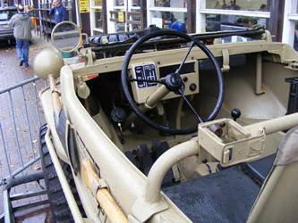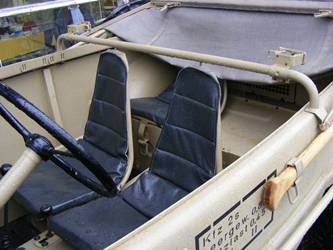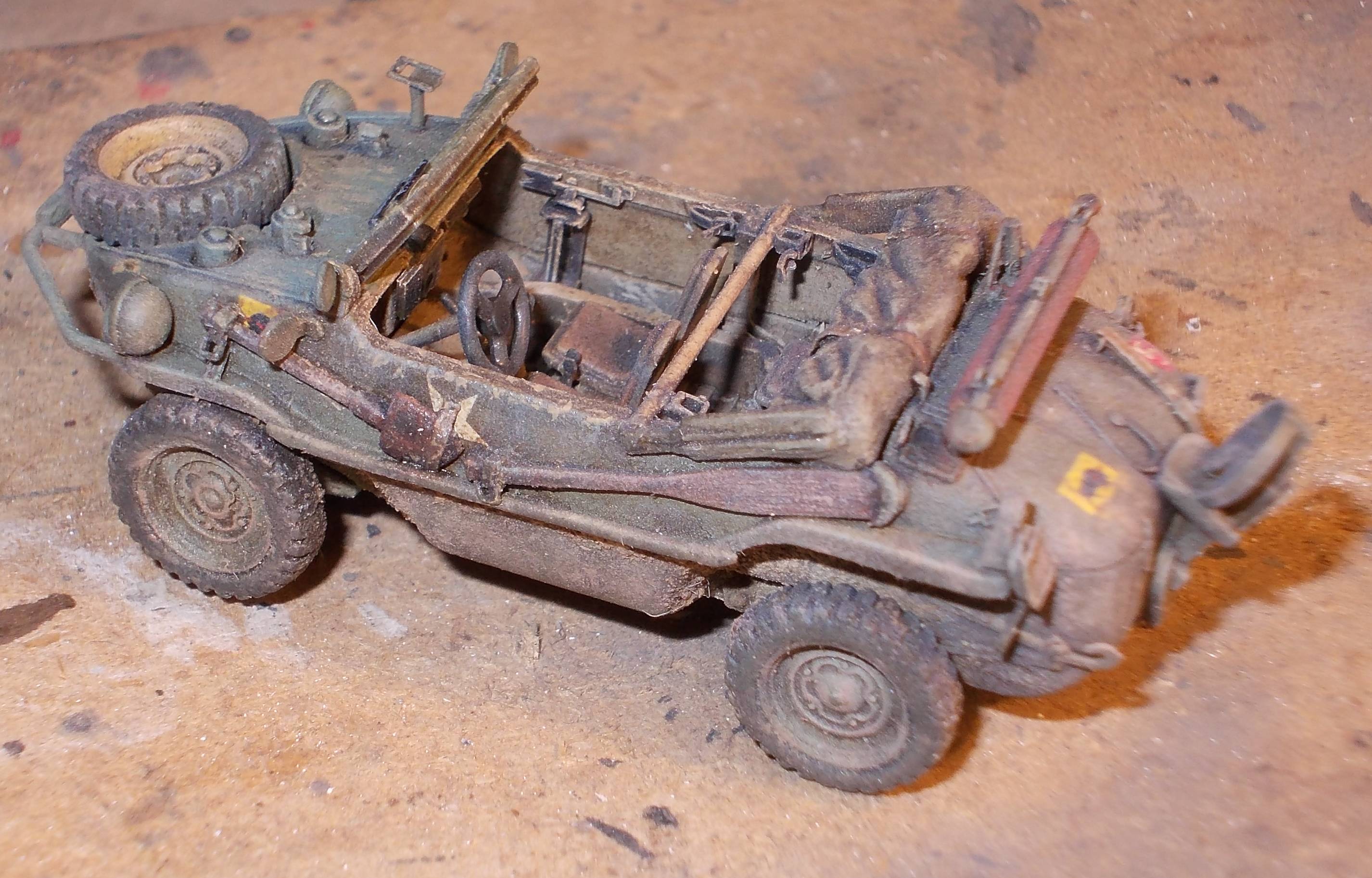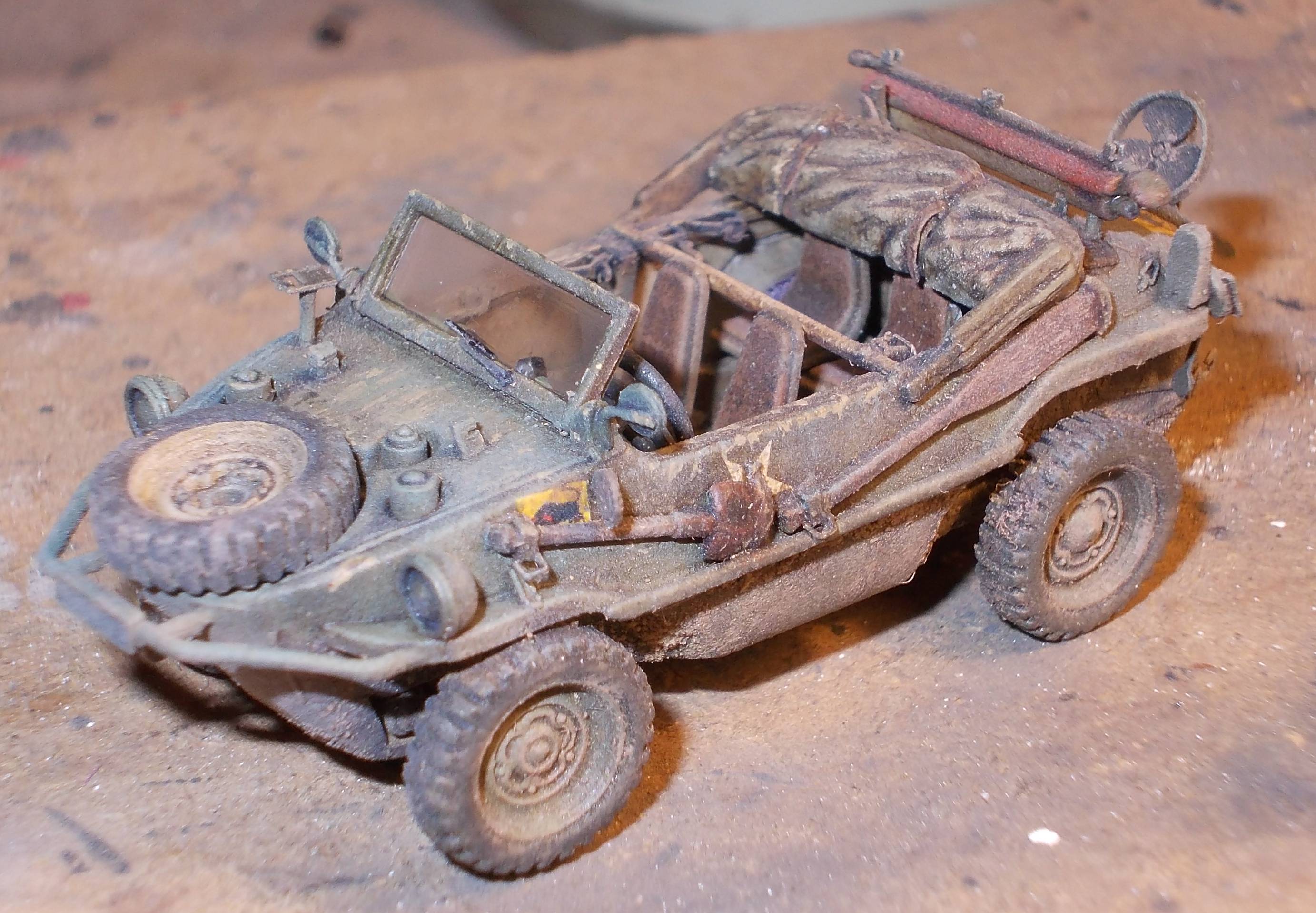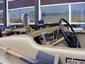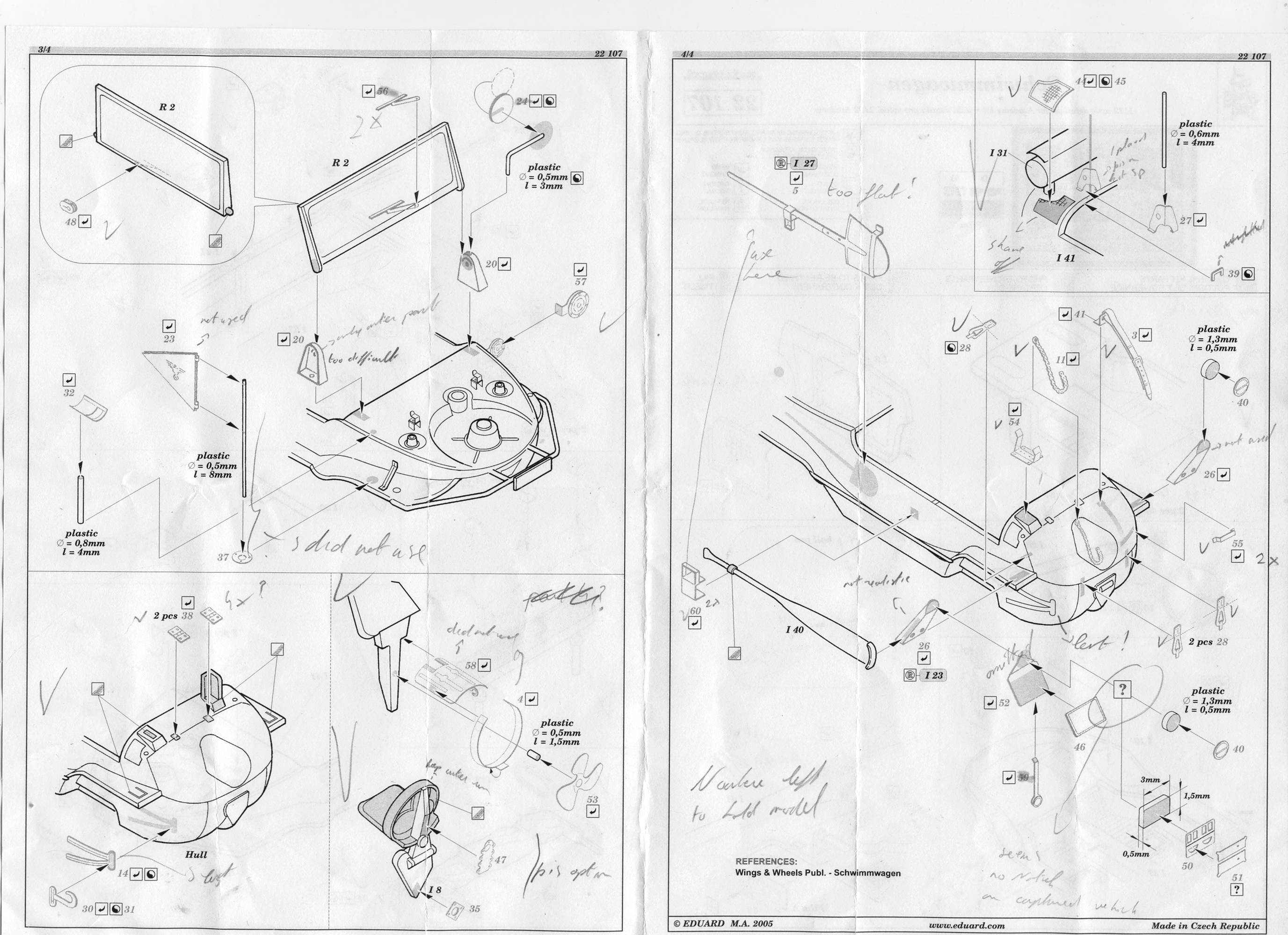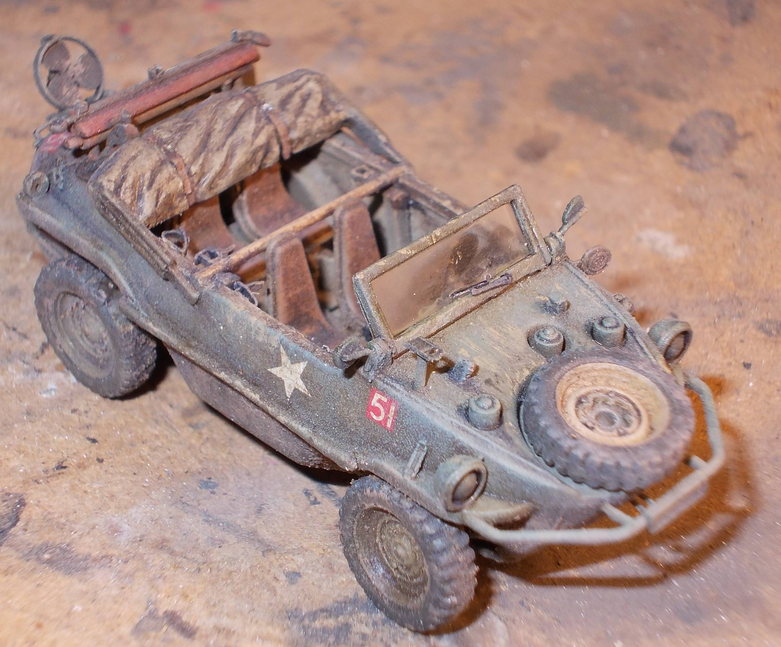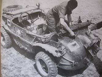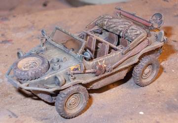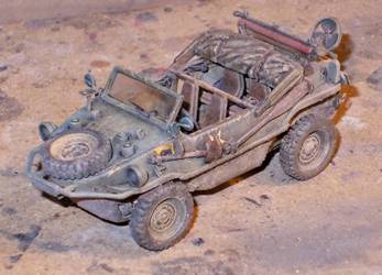 latter were beyond the reach of my modeling skills. It's a pity that Academy only provides a stowed hood, and, to boot, one that doesn't even fit nor exactly look like a real folded cover would. The oar that is fitted just below it also gets in the way, so this really is an area where Academy messed up quite badly. I needed to shorten the oar by a couple of milimeters to make it fit. As I was trying to build the exact same vehicle as in the picture below, I didn't fit a Notek (neither front or rear), but I did fit the shovel. The picture doesn't show it, but it might have been fitted. I cut off the attachments of the Eduard shovel (which is too flat) and added it to the Academy plastic part. The MK72 wheels are a drop fit as they replicate the fittings of the Academy kit very well. Only minor clean up of the thread and priming were needed. Eduards also provides a command pennant, by the way, which I didn't use. For those building a regular German Schwimmwagen, note that the interior fittings seem to be meant to hold an MP40 and Panzerfaust, and that an MG would probably have been fitted. Personal gear, like canteens and gas masks would be fitted in the (by then) crowded interior. Some minor additions/modifications were performed at the very end. I replaced the exhaust stubs with bent styrene tubing, to make them point to the rear. For those who want to go even further, two small pegs might be added to the top of the windscreen (which held the canvas top in place), and a horn placed below the right front fender. (The picture of "my" vehicle didn't show this area.)