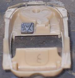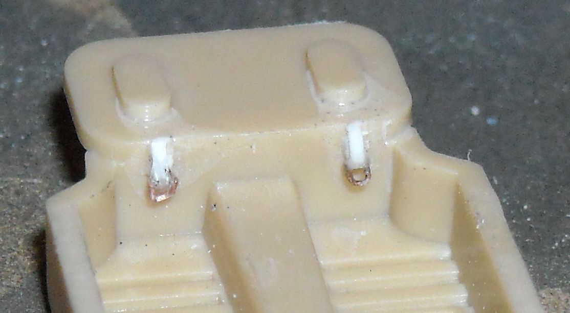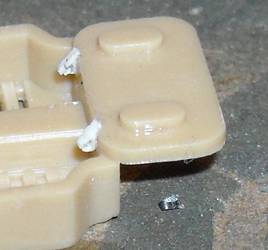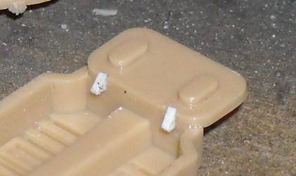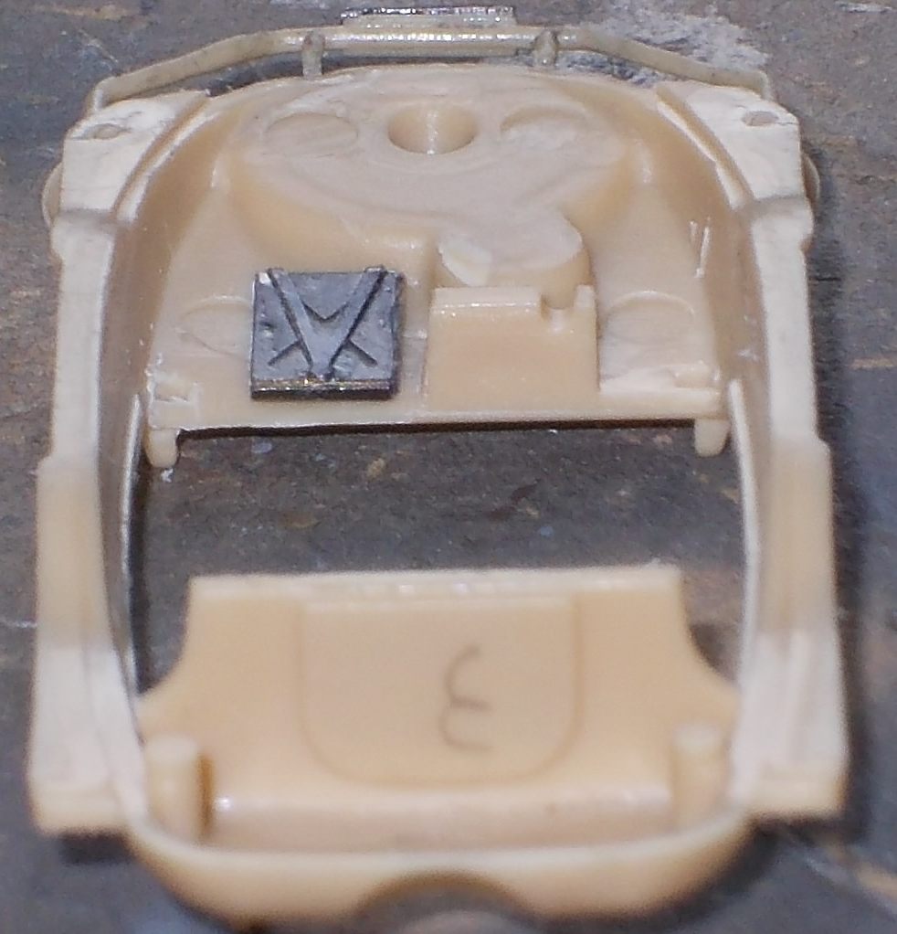 As an interlude I added the straps to the folded hood and carved some detail into the sides to represent the folded frame. I prepared the exhaust by adding the small U-shaped fittings, but not the metal shield, as I wasn't able to fold it to a shape conforming to the kit part. Next step is the nosejob, where some fittings need to be added to the area in front of the windshield. Again parts were lost (49) and thus replaced with bits of styrene. I left off the tow hooks (front and rear) until the very end by fear of loosing them as well. Note that on the rear of the vehicle the nose hook can be folded back. Choosing when to actually join the
