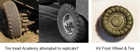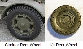 Both the front and rear tires, along with their associated wheels, are atrocious. The rear wheels are featureless and lack the prominent spokes seen on wartime Clarktors, while the front wheels lack the recessed disc. The rear tires have next to no tread, and what tread they possess is not accurate. But they are at least somewhat palatable compared to the front tires. The front wheels exhibit more tread than the rears, but this tread unfortunately looks more like a rolled up millipede than a proper tread. My best guess is that Academy tried to replicate the tread pattern see on the restored example seen above.