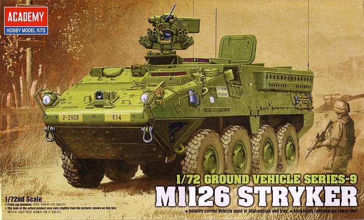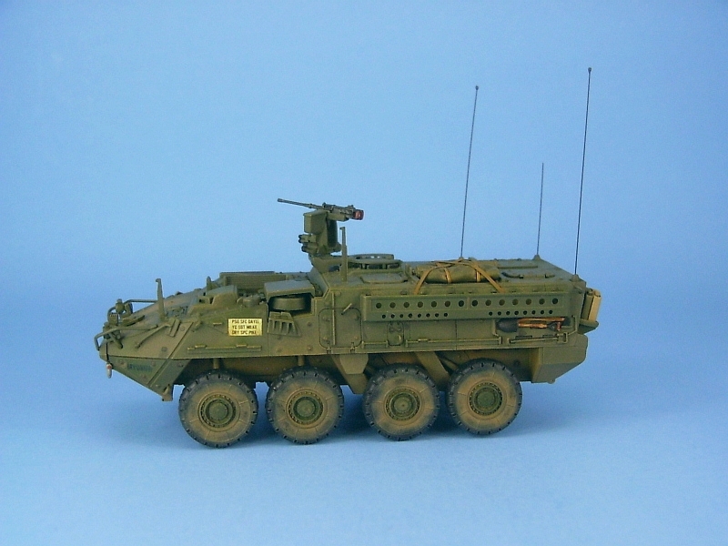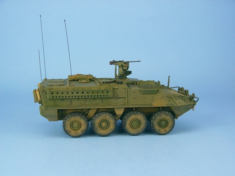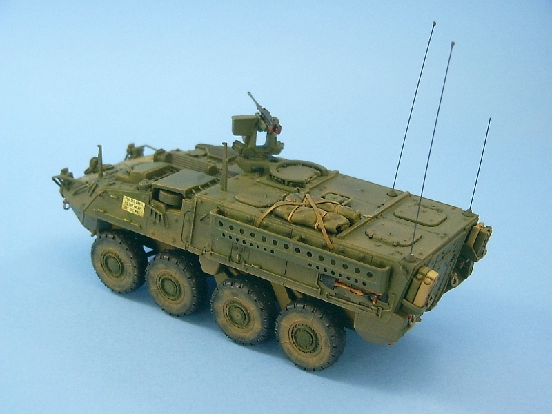 Academy's Stryker makes into a nicely detailed kit straight from the box. The only quibbles I have with it is the lack of external stowage and most of all the very poor tires. Apparently aftermarket replacement wheels are available and the lack of stowage was addressed by Academy when they reissued this kit (kit no. 13413) with a resin stowage set made by Legend.