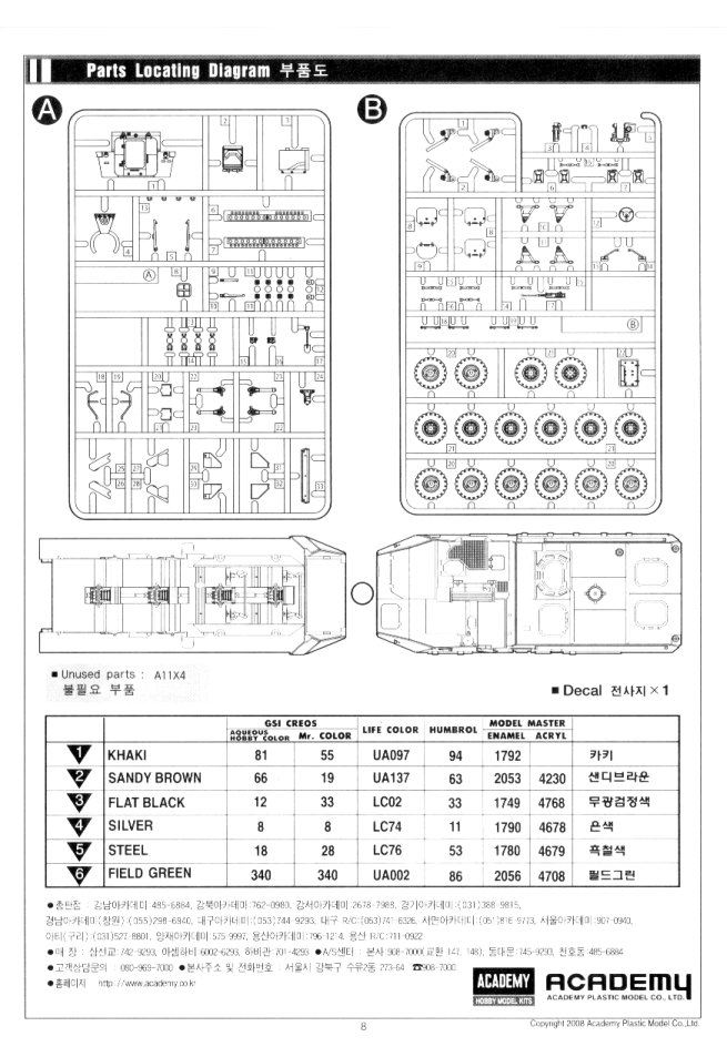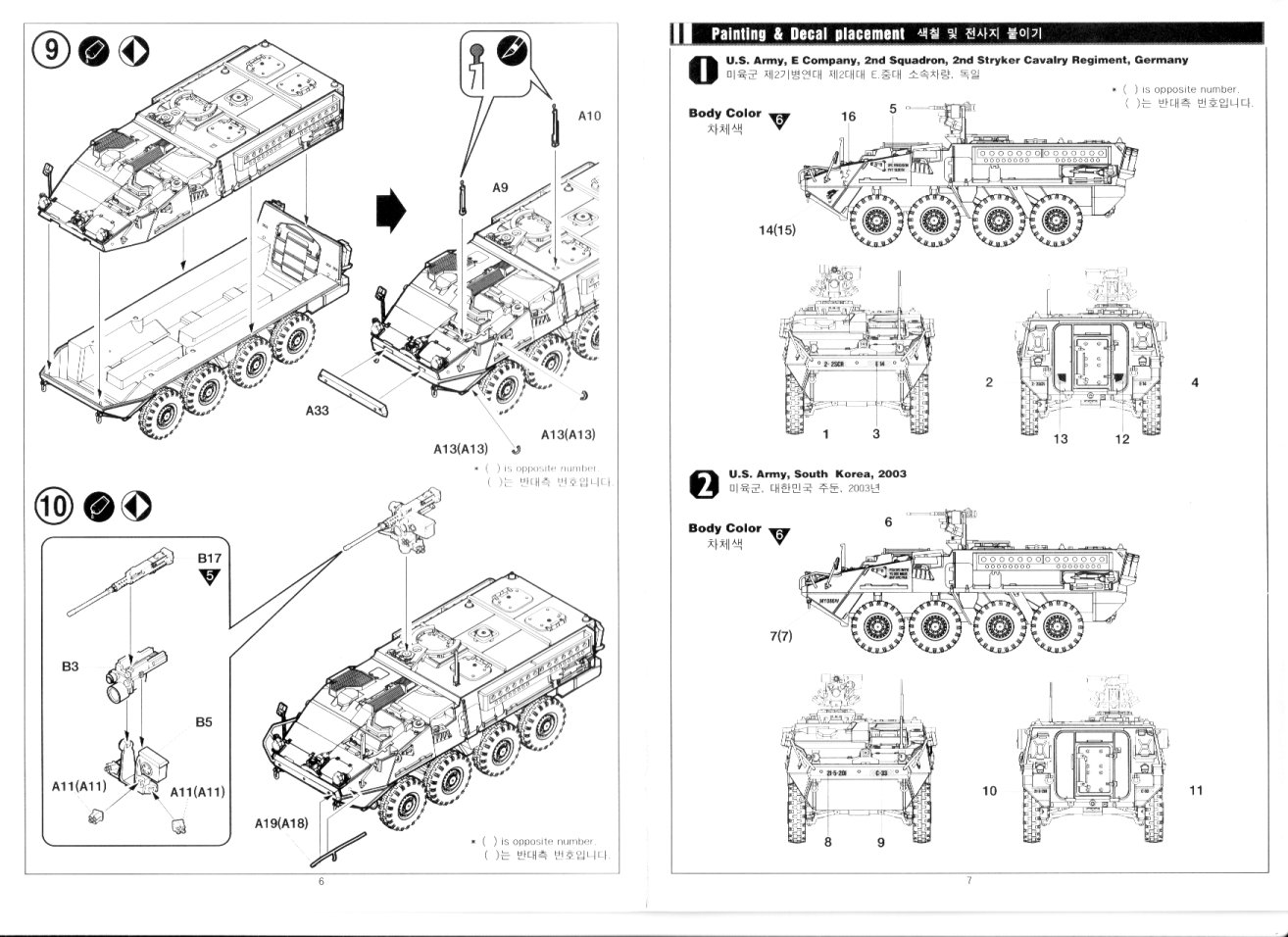 There is a small decal sheet with markings for two US Army Strykers in overall green camouflage: