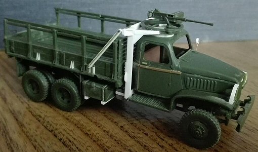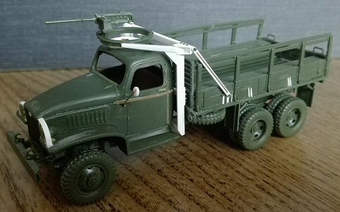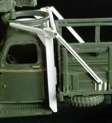 M37 mount The AA MG mounts for the closed cab were the types M32 and M37. The kit proposes the M32 type, but it isn’t correctly reproduced and if used, should be modified. According to the photos I consulted, this type was only fitted to steel bodied trucks, while this kit has a wooden body. The vertical rods were rounded with rectangular fixing plates, the horizontal arms were triangular and the oblique rods were plain triangles which formed a rhomboid shape with the forward triangular plate. An interesting article can be found in the French magazine Vehicules Militaires # 55, February/March 2014. For my closed cab truck, I choose to make a M37 mount, which could be used for both long and short wheelbase chassis. It was made in four variants; the type used on a 353 chassis with wooden body was the M37A2 (there were difference in the way it was fixed to the walls between the wooden body and the steel one). The frame wasn’t attached to the body as for the M32, it had a different shape and the ring supports were shorter. |