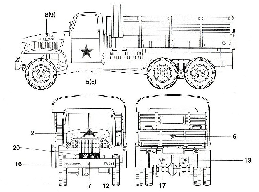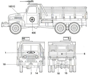 The variant proposed in the kit has a closed cab with a wooden type body, produced until February 1943 (when the asymmetrical brush guard was introduced), proceeding the introduction of the open cab of the late production (4th, 5th and 6th series). The supply catalogue number for the truck 2 ½-ton, 6x6, GMC CCKW was G508. The 1st batch, produced from December 1940 till January 1941, had a civilian cabin and was called CCKWX. The 2nd and the 3rd series were produced January 1941 to March 1943 and their closed cabin could have a rounded hole for the MG. Two types of chassis were used for the CCKW, the type 353 (used in this kit), was the longer one. The shorter version, used for about the 10% of the CCKW production, was called type 352. Another closed cab version, called CCW-353, was a 6x4 variant. The kit gives you the option between the standard bumper and installing the winch, which was used on almost half of the total production (both chassis type, short and long). The kit chassis has a Timken split axle. The Chevrolet banjo type was also used, but this different axle type meant also a different layout of the drive shafts. Compared to the open cab truck kit, the conversion possibilities are even bigger (see Heller/Airfix CCKW review for a short wheelbase 352 conversion) because the closed cab truck kit could also be converted (with some more work) into the 1.5 ton 4x4 variant G506 made by Chevrolet. The 108”x 86” flatbed cargo G506 with the winch was called G7117, G7107 being the number without winch. Good